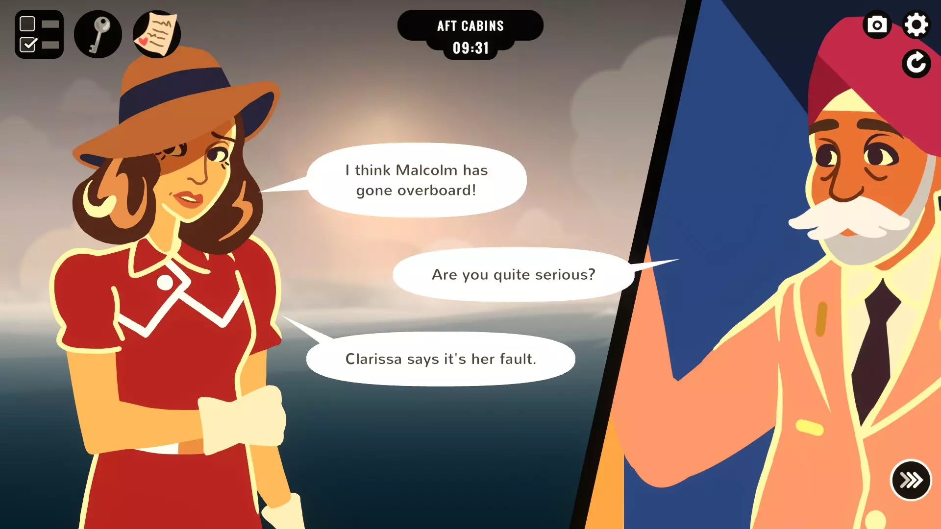 本指南包含通用技巧、角色日程安排以及如何获取所有成就 简介 《Overboard!》有着众多动态元素和紧凑的日程安排,所以玩家会遇到卡关的情况是很正常的。本指南将提供一个通用流程,以及针对各个成就的更具体攻略。 我建议你先好好尝试自己理解这款游戏,因为弄清楚该做什么本身就是游戏的一大乐趣。本指南中有一部分内容不会提供明确信息来帮助你掌握基础玩法,但在此之后,游戏的内容将会被完全揭示。请谨慎阅读。 非剧透技巧 保持你的说法一致。在会议中自相矛盾会立即让你变得可疑。比如,在我的第一次游玩中,我告诉所有遇到的人我的丈夫已经死了……但对克拉丽莎除外,我为了让她冷静下来,说他还活着。结果在会议上,她指出我对她撒了谎,这让我的处境彻底完蛋。几乎每个人在和你交谈时都会问你丈夫在哪里,所以一定要给出前后一致的回答。同样,当有人问起你的耳环时也要小心,因为卡斯特雷特会问多个相关问题,很容易说漏嘴。(我有一次告诉他那不是我的耳环,接着又声称是克拉丽莎从我这里偷走了耳环。不出所料,我被捕了。) 同样,要保持行为端正。被抓到闯入船舱或随意威胁他人都会让你的可信度大打折扣。 提前制定计划。开始游戏前,先坐下来想想你想要达成什么结局,需要做些什么,以及这些事情必须在何时完成,这样你才不会措手不及。我就曾多次搞砸游戏流程,因为直到为时已晚才想起拿安眠药或克拉丽莎的舱房钥匙。 你可以随时前往礼拜堂向上帝求助。祂的提示虽然有些含糊,但任何线索都是有用的。 你上一次【完成】的游戏流程中采取的行动会保存下来,供未来的游戏流程使用。例如,如果你能说服克拉丽莎到上层甲板和你谈话,那么你用来说服她的话语会保存到下一次游戏流程中。这能让你跳过已经熟练掌握的部分,从而节省一些时间。“已完成”状态会被重点标记,因为重置到上午8点会恢复到上次保存的选择,而非重置后这一轮中所做的选择。 在地图上按铃会立即切入会议。如果已为会议做好所有准备,按铃可以节省一些时间。此外,这是速通成就的重要组成部分,因此无需等到15:00。 由于本游戏为非线性,存在多种有效的游玩方式来达成相同结局。如果你的路线或时间安排与我的不完全一致,无需担心! 时间表 本游戏采用24小时制,因此本指南也将使用24小时制。你有七个小时的实际策划时间和一个小时的会议时间(游戏从8:00开始,乘客会议于15:00开始)。时间并非完全精确,例如我记录的卡斯泰尔斯到达上层甲板的时间是8:30,但我去拿耳环时看到他是8:33左右到的,所以要注意。另外,当你在有人活动的区域时,他们离开或进入时会有独特对话(如果你在客舱走廊,克拉丽莎会在9点到达时哭着把你推开,辛格少校则会在10点时自我介绍然后走开) 克拉丽莎·特彭泰恩 8:00-9:00 在餐厅哭泣 9:00-15:00 在她的客舱哭泣 只要她在客舱里,你就可以说服她到上层甲板和你谈话,这会给你一个短暂的机会闯入她的房间或在甲板上和她见面,或者两者都做。这个技巧可以在一次尝试中多次使用。 理查德·卡斯泰尔斯 8:00-8:30 在他的船舱内 8:30-9:20 在上层甲板散步。注意:如果你在此之前还没找回你的耳环,现在耳环就在他那里,你必须处理这个麻烦。 9:20-11:30 在吸烟室打牌,可以和他赌钱。 11:30-12:30 在上层甲板 12:30-15:00 回到吸烟室继续打牌 任何时候,如果你发现了偷渡者,你都可以用她来要挟他。要做到这一点,你可以要么一早就去他的船舱偷听,要么从阿姆斯特朗夫人那里学到敲门暗号后自己去查看。这也会改变他在【上层甲板】的对话,变成他威胁你,这可以用来杀死他。 萨布吉特·辛格少校 8:00-8:20 在【上层甲板】,但他离开得很快,你根本不可能追上他。 8:20-10:00 在他的船舱里,会偷听任何与克拉丽莎的谈话。 10:00-15:00 在【吸烟室】。15:00时,他会发现马尔科姆不见了,并发起会议。 如果卡斯泰尔斯落水失踪,辛格最终会注意到。如果你在【吸烟室】,大约12:30时,辛格会问卡斯泰尔斯去了哪里,你可以让他去甲板上找找。然后少校会前往那里,你就可以将他杀掉。 霍诺里亚·阿姆斯特朗夫人 8:00-8:30 在【餐厅】吃早餐。 8:30-9:40 在她的船舱里。 9:40-11:00 在【上层甲板】。 11:00-11:25 在【礼拜堂】祈祷。如果跟着她进入礼拜堂并偷听,她会在施舍盘里留下200英镑。 11:25-13:30 在餐厅饮酒。这是你用安眠药给她下药的机会。 13:30-15:00 在她的卧室睡觉。处于易受攻击状态。 你只有有限的时间去了解卡斯泰尔的敲门方式,或者从她那里买下勒索信息,因为她上床睡觉后就无法再与她交谈了。 安德斯指挥官 8:00-8:30 在餐厅吃早餐 9:00-11:00 在舰桥 12:00-15:00 再次在舰桥 在早餐期间或他的第一次舰桥值班时,你可以与他约定11:30的幽会。这会开启浪漫剧情并允许你偷走他的通行证,但如果你错过了这次会面,在本次尝试剩余的时间里他将拒绝与你交谈。通常来说,如果你惹恼了他(比如错过幽会、杀死乘务员、敲诈他),在本局游戏剩余时间里他会拒绝和你说话。 另外,如果他正在舰桥值班,你可以将某人从上层甲板扔下而不会直接导致游戏结束! 其他定时事件:你丈夫的夹克,里面有他的钱包和克拉丽莎的钥匙,可以在吸烟室找到。快到中午时,会有一名工作人员将夹克移到你的客舱……但他会偷走钱包。 上午10点半左右会有一名女仆进