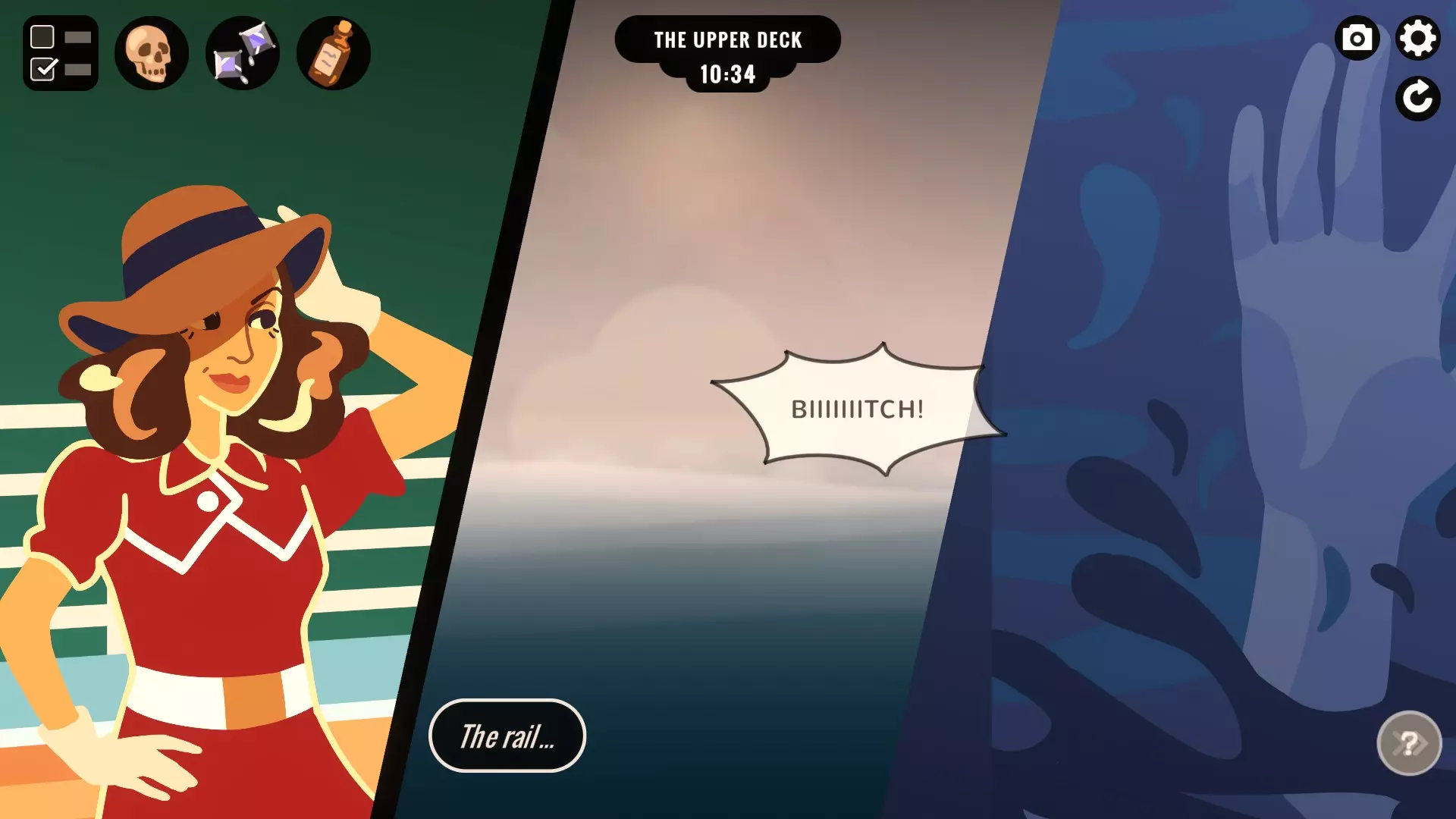 谋杀者 出色执行与快速欺诈:在5小时内或2小时内(!!!!!!)嫁祸他人谋杀。第二个目标的要求非常非常严格。 前往吸烟室,从外套处拿到克拉丽莎的船舱钥匙。前往她的船舱,从书桌拿一封情诗,然后离开船舱。在走廊等待克拉丽莎出现。向她出示情诗,并告诉她“他跳下去之前把这个给了我。”克拉丽莎会以为是自己杀了他,并且会毫无异议地认罪。敲响辛格少校的房门,说你的丈夫坠海了。接下来的剧情会快速推进,克拉丽莎会认罪。