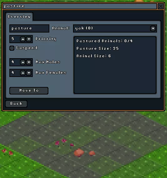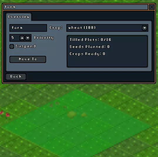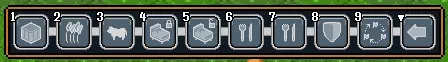 种植可再生作物对生存至关重要。选择此按钮会出现区域选择光标。农场只能建在泥土上。与树木不同,目前农场不需要直接光照,因此如果地面空间不足,你可以在地下建造农场。在建造农场前,你需要清除目标区域内的黏土或其他类型的地面。 选择农场区域后,会出现上述菜单,你可以在其中选择作物类型。点击农场菜单中的“返回”按钮后,你的地精会立即开始种植作物。他们会持续收获和种植,直到你摧毁农场或选择暂停按钮。暂停指令会让你的侏儒停止田间劳作,但植物本身会继续生长(前提是农场内的地块在暂停指令下达前已完成播种)。 牧场: