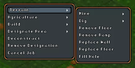 1. 挖掘子菜单 2. 开凿子菜单 3. 移除地板 4. 移除斜坡 5. 替换墙壁 6. 替换地板 7. 填补洞穴 挖掘: