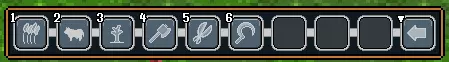 1. 农场 2. 牧场 3. 种植树木 4. 砍伐树木 5. 采集插条 6. 觅食 A. 小树林(目前仅在弹出菜单中显示) 农场: