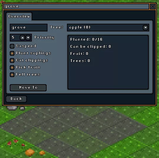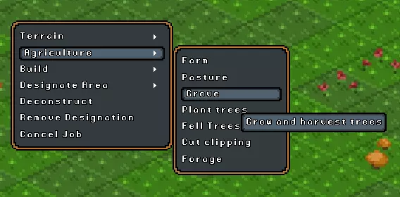 种树工具: 此工具用于种树。选择树木类型(前提是你拥有插条),然后框选想要种树的区域。除了用于美化环境种植树木外,该工具没有太多其他用途。 砍树: 此工具用于获取木材。通常情况下,你需要先执行【剪枝】或【觅食】命令,除非你不需要树苗或苹果。 剪枝: 树木插条可用于种植新树。每棵“开花”的树只能使用一次该命令。对树木进行剪枝后,必须等待数天才能再次使用该命令。如果对苹果树使用【剪枝】,将同时收获树苗和苹果,这是一种节省时间的做法。觅食: 觅食可用于植物和树木。只有苹果树可以被觅食。对植物进行觅食会收获其产物和种子,过程中会摧毁该植物。对树木进行觅食的好处是,其再生速度比截取枝条更快。被觅食过的苹果树会呈现出没有可见果实的状态。 树林: