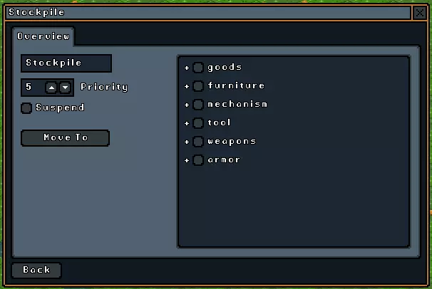 储物堆是你的地精用来存放从世界中收集到的所有物品的地点。储物堆可以设置得非常细致;你可以将一个地点限制为只存放一种类型的泥土,或者只存放牦牛肉而不是所有肉类。通过展开每种物品类型旁边的气泡,你可以根据需要开启或关闭它们。 此时我还想提一下,许多物品可以由玩家重命名。这对储物堆来说非常有用,因为随着游戏的深入,你可能会发现自己拥有过多的储物堆,却不知道哪个储物堆存放着什么东西。我个人发现创建多种不同类型的特定储物区非常有用,比如专门存放三明治材料的储物区,或者只存放泥土的储物区,并将它们设置在使用这些材料的工坊附近。我还会创建一个“通用”储物区,让我的地精可以存放所有杂项物品。这样我就能判断是否有必要为这些物品创建专门的储物区。 储物区与存储容器搭配使用时最为有效,你无疑会很快发现,一堆零散的物品会迅速占据空间。我的建议是,如果你要在整个储物区都放置容器,最好留一个角落空着。这样一来,你就能一眼看出某个储物堆是否已满,因为你的某个地精会把物品放在那个空位置上,而不是放在储物容器里。 农场和牧场: 这两个命令与农业子菜单中列出的命令完全相同。有关更多信息,请参阅本指南中的该部分内容。 个人住所: