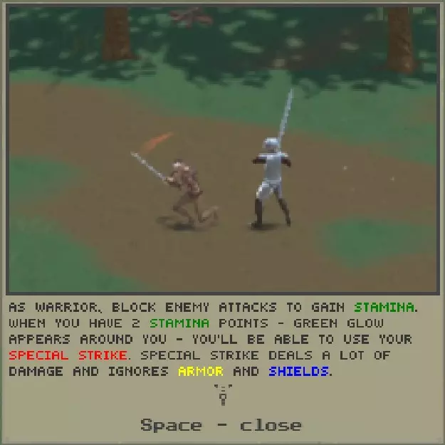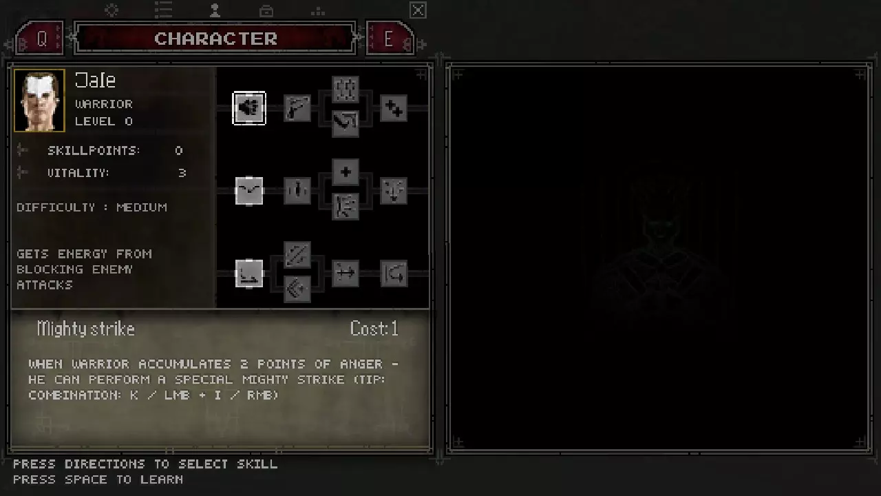 战士拥有三个分支的技能: 1.1 强力打击【1技能点】——当战士积累2点怒气(能量)时,可施展特殊的强力打击【激活方式:攻击+格挡】; 1.2 投掷【2技能点】——战士将敌人掷向其同伴,对他们造成伤害并将其击倒。要施展投掷,需在靠近敌人且敌人正从先前攻击中恢复时发动攻击; 1.3a 活力【4技能点】——艰苦训练使战士对所有伤害的抵抗力增强(+1活力/生命值); 1.3b 猛踢【4技能点】——连击的最后一击现在造成更多伤害;4) 强制格挡【8技能点】——战士学会格挡几乎所有近战攻击,也能格挡来自背后的攻击【强力攻击在挥击时带有红色轨迹】。 .....2.1) 高跳【1技能点】——战士学会跳得更高【要执行高跳,在奔跑时按下跳跃键】; .....2.2) 天降正义【2技能点】——战士学会在高跳时施展强力一击; .....2.3a) 灵巧【4技能点】——战士学会在战斗中优雅移动,避免受到严重伤害【+1活力/生命值】; .....2.3b) 格挡箭矢【4技能点】——战士学会格挡飞来的箭矢和其他投射物; .....2.4) 空中斩击【8技能点】——普通跳跃攻击现在造成的伤害大幅提升。 .....3.1) 滑行 [1技能点] - 战士学会利用移动 momentum 进行地面滑行(有助于躲避投射物)[激活方式:奔跑时按下闪避键]; .....3.2a) 顺势劈砍 [2技能点] - 战士现在可以在滑行中发动攻击 [激活方式:滑行时按下攻击键]; .....3.2b) 闪避 [2技能点] - 战士现在可以使用特殊动作快速后跳脱离危险区域 [激活方式:按下闪避键]; .....3.3) 反击 [4技能点] - 完成闪避动作后,战士可以立即发动反击,使对手短暂眩晕 [激活方式:完成闪避动作后立即按下攻击键]; .....3.4) 偏转 [8技能点] - 战士现在可以将飞来的投射物(包括魔法类)反弹回攻击者(用普通攻击击中飞行的投射物)。强烈建议在获得第一个技能点时解锁技能【强力打击】[1.1]。
