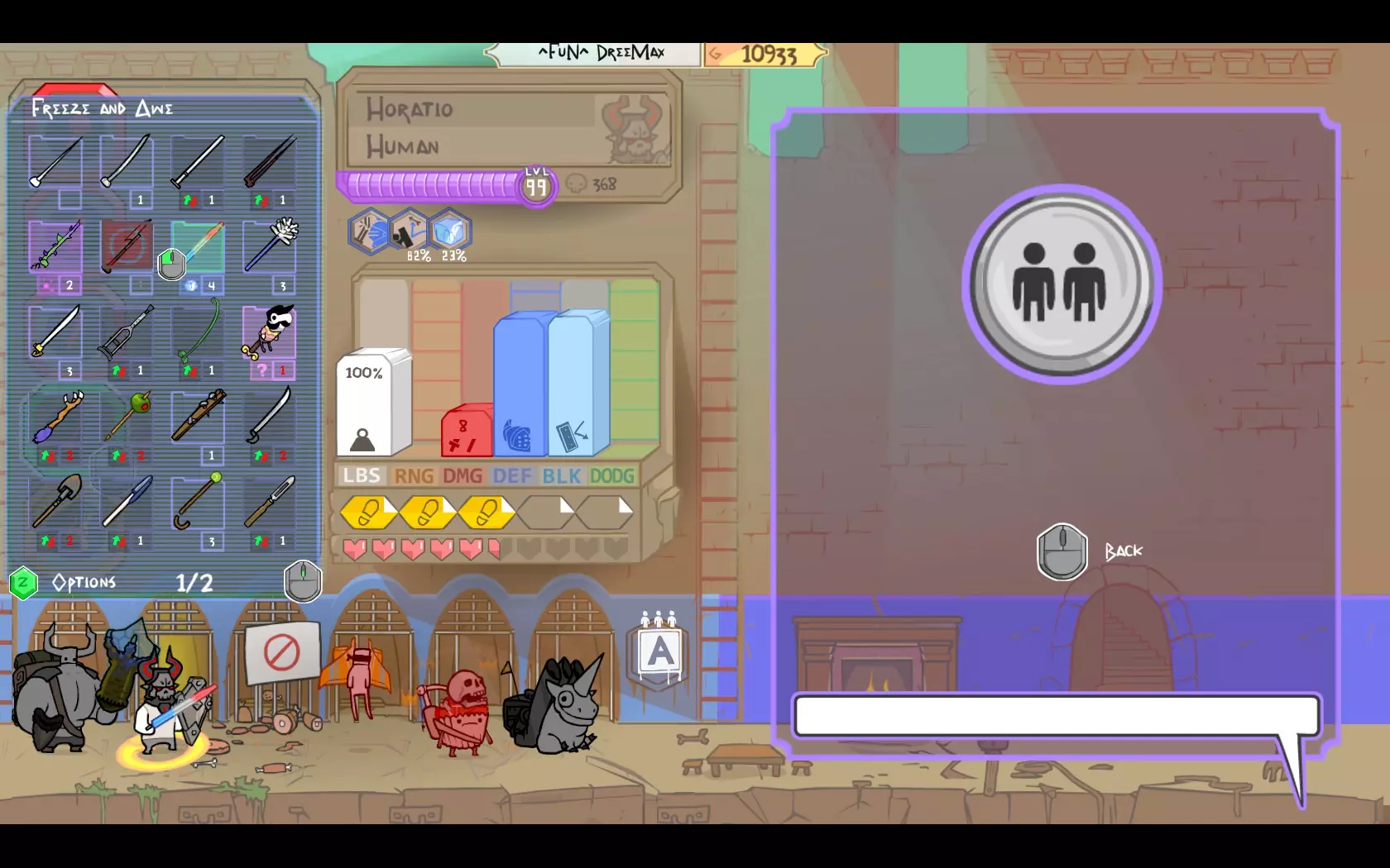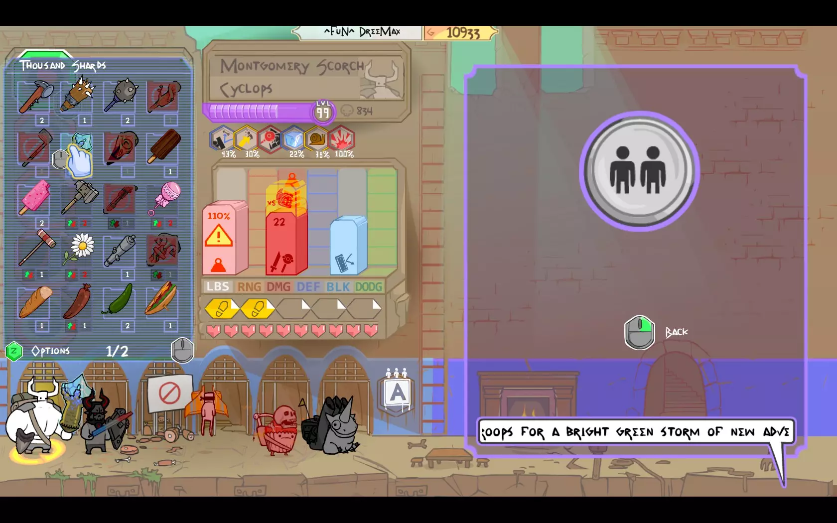 角色定位:一旦获得【千片碎击】,独眼巨人便成为你的主要输出/控制角色。该武器同样存在运气/霉运因素,因此要做好目标可能未命中以及意外冻结己方队友/自身的准备。与敌人保持距离,优先使用范围冻结攻击而非近战攻击。【千片碎击】对戴头盔的敌人仍有额外伤害,但相比其他重型战锤,其近战攻击造成的伤害较低。 独眼巨人的次要定位是肉盾。凭借高额生命值,他能承受大量伤害,且能较好地抵御弓箭手及各类远程攻击。在纯坦克型人类之后,他是第二个能阻挡远程攻击的角色。如果你选择按我的方式(仅装备中型盾牌),则需要更加谨慎操作,并获得【纸杯蛋糕】更多的支援。需要小心的敌人:八眼巨人的控制技能可能会带来麻烦。由于毛发巨魔对冰系攻击有抗性,在一对一战斗中可能会造成困扰。 纸杯蛋糕 角色定位:纸杯蛋糕应作为你的队伍领袖。这样他在回合中会有4点行动值,能提供最佳的治疗管理。其额外的治疗能力自然无需多言。躲在独眼巨人和坦克身后,必要时让精灵为你方提供掩护。如果队伍状态良好,你可以跑开并通过治疗自己来跳过几个回合(但要注意敌方的彩虹马或迫击炮是否还存活)。 需要小心的敌人:或许你只需不害怕敌方的纸杯蛋糕。其他敌人都会很乐意把你当晚餐吃掉^^ 同时也要尽可能避免受到中毒伤害。 精灵防御装备:普通头部皮肤可提供最高闪避率(你可以搭配帽子/头盔,但会损失伤害和闪避) 角色:小精灵是你的近战辅助输出。带有火焰伤害的范围攻击能有效对抗 troll(巨魔)。尽量避免进入近战距离,躲在坦克身后。缺点是小精灵的命中率有时会让你抓狂 -_- 需小心的敌人:电子机器人以及任何使用电属性伤害武器的敌人。还有独眼巨人、女吸血鬼这类高伤害敌人。 彩虹马。角色:远程至上!尽管命中率不怎么样,但它仍是游戏中顶尖的输出之一。彩虹角爆炸拥有巨大的范围伤害和单体伤害。一定要为你的彩虹马留出足够大的空间。 需小心的敌人:彩虹马。说真的,敌人中的彩虹马通常是最大的威胁,而且它们的角爆炸运气总是特别好。 优势与劣势 优势:几乎能应对游戏中所有敌人组合。拥有巨大的范围伤害和强大的控制能力。适合每日进行疯狂的不公平挑战刷取。招募容易。从游戏初期就能快速组建。 劣势:移动能力中等。缺乏剧情模式角色。玩法围绕独眼巨人展开。需要一些时间来适应移动方式。对付多方向来的敌人表现不太好。 结语。 希望你喜欢我对游戏中最佳队伍的看法,也希望这份指南对你有帮助!有任何问题都可以问。 ^FuN^ DreeMax。