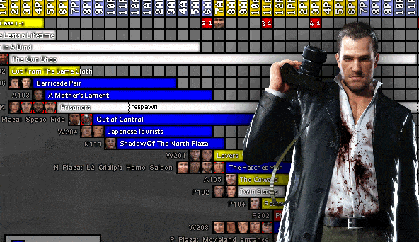 所有事件(包括未公开事件)的可视化时间线。包含幸存者面容、精神病患者、地点以及事件时长。设计为一页呈现。可视化时间线