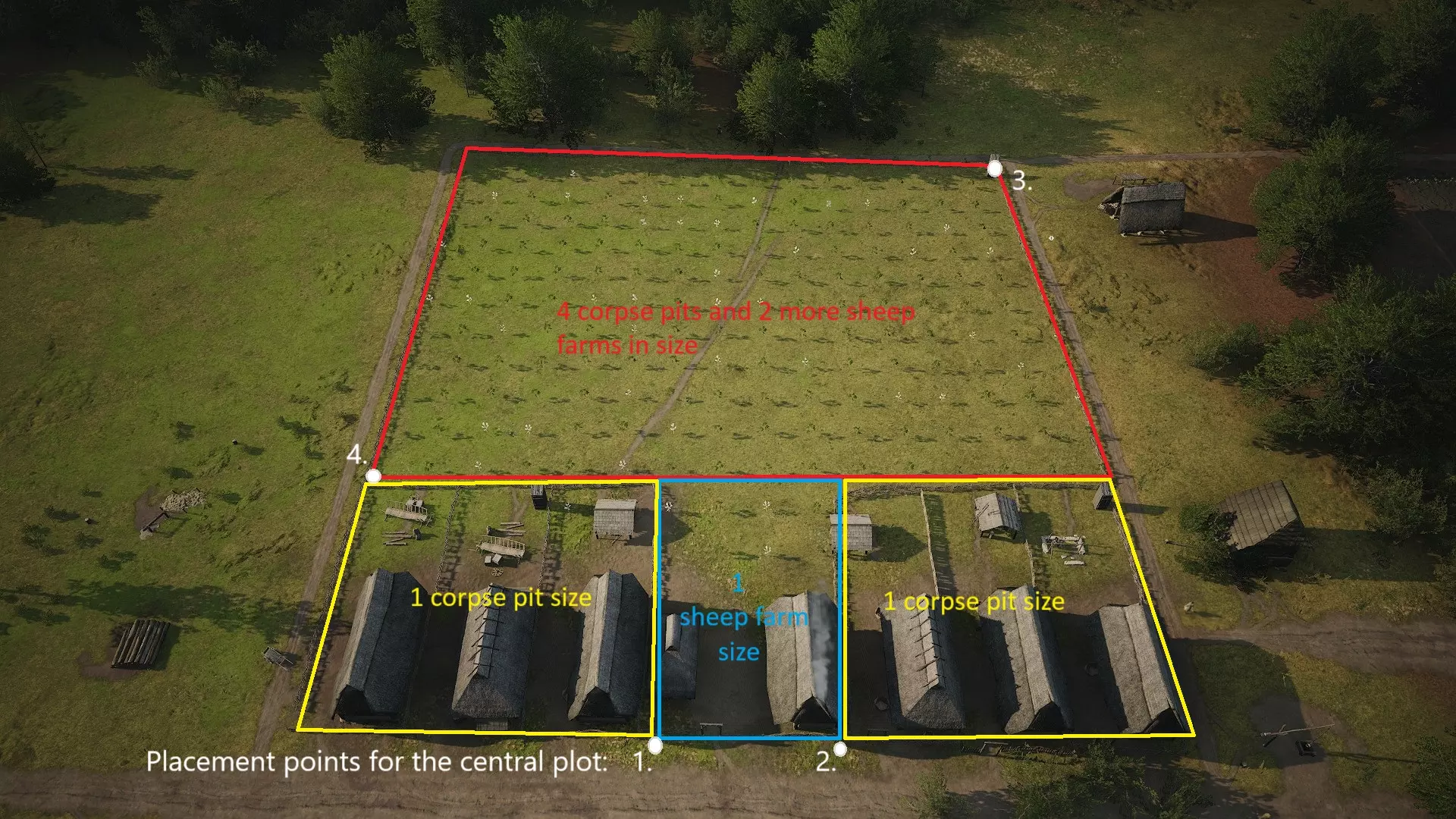大致操作方法如下。对于果园来说,这么大的后院完全够用。果园甚至可以更大,但没必要。对于这种设计的菜园,我建议后院面积减半,也就是相当于2个【尸体坑】的大小,而不是4个。