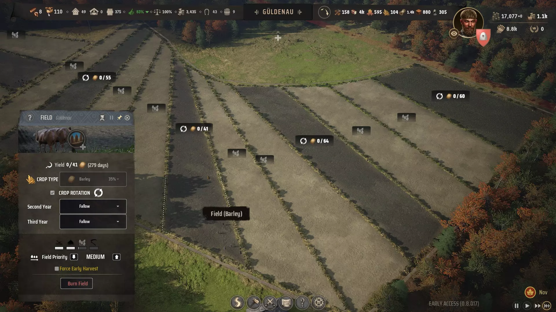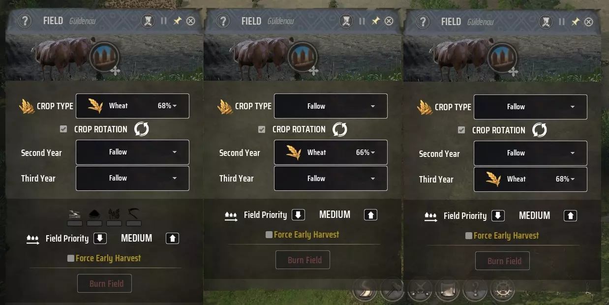 这是在整体肥力为35%的黄色(+)和浅橙色(-)肥力土壤上,每摩根大麦田的预估产量。对于低肥力地区来说,这个产量已经相当不错了。虽然贸易站有时可能需要进口大麦,上限约为80单位左右,但一年中大部分时间,年度收成足以满足麦芽酿造的需求。 即使在低肥力地区,通常也会有浅绿色(++)的小麦土壤斑块,其肥力可达70%。一个拥有15块田地的农场,每年耕种5块每块1摩根的田地,8户家庭就能轻松完成耕作。 每块田地的绝对最大面积应为1摩根,如果你打算使用牛来耕作,可能还需要把田地弄得更小一些。使用重犁的牛群有着非常独特的移动方式,这种方式最适合宽度不超过房屋、呈狭长矩形且总面积在0.5-0.8摩根的田地。 通常来说,拥有更多小块田地有时比拥有少量大块田地更有效,因为大块田地需要更长时间来耕种,而到季末仍未完全耕种的田地,要么在来年完全没有收成,要么产量会远低于正常水平。 季末时,你更愿意选择哪种情况?是三块2摩根的田地都只耕种了一部分,导致来年预估产量只有2-9;还是12块0.5摩根的田地,其中4块已在季末前完全犁好,产出的谷物足够制作数百单位的面包? 根据我的经验,没有重犁的小麦农场可以耕种9-12块田地,每块最多1摩根,每年耕种其中的三分之一。这些田地形状可以不规则,对手工犁地没有影响。每三分之一的田地应采用如下轮作方式: