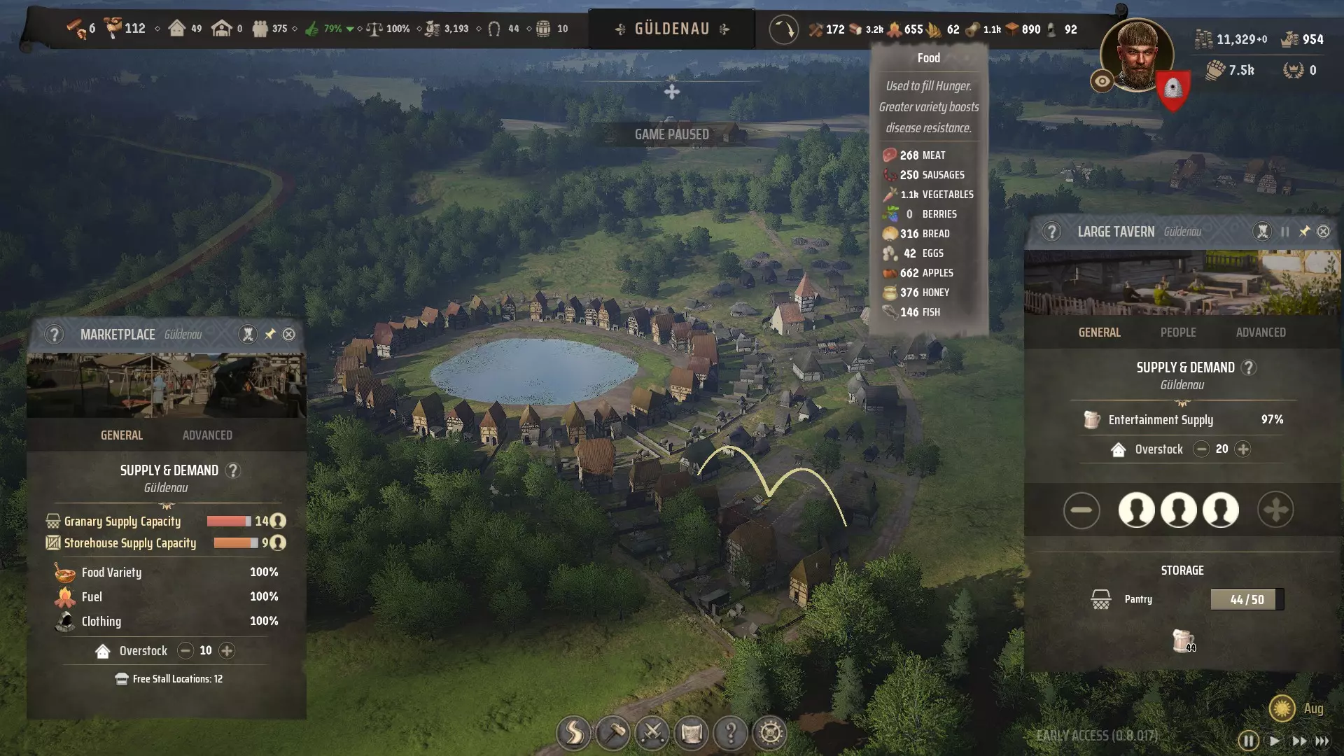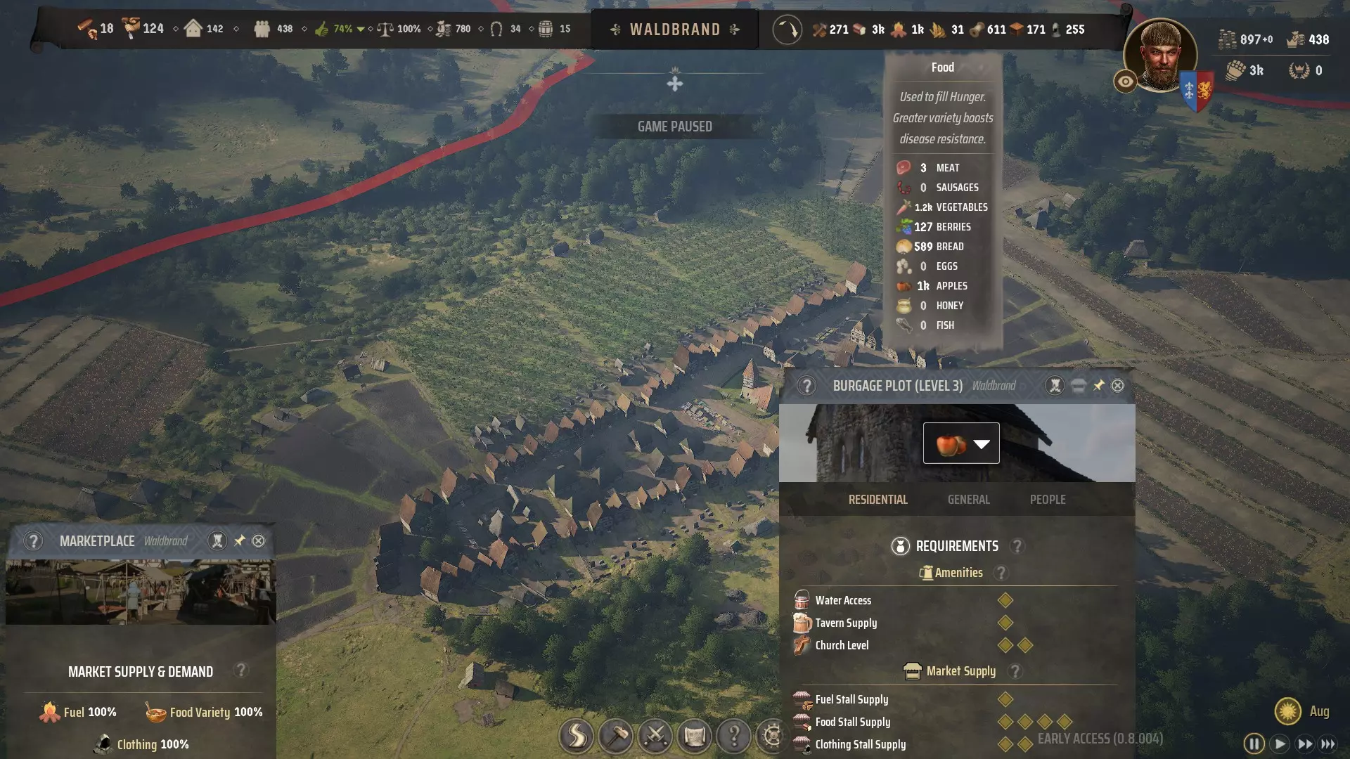 1. 少即是多 我知道油管上有很多关于《庄园领主》中拥有庞大人口巨型城市的视频,但这些大多是由拥有顶配游戏电脑的主播制作的。我们大多数休闲玩家没有足够的硬件来支持如此庞大的城市,而且游戏中大多数问题都出现在人口数量较高的时候。 养活人口较少的城镇也容易得多,因为养活一个二级村庄并让所有人都保持快乐,比管理一个三级城镇要简单得多。 最佳平衡点在300-500人口之间。这时你会拥有过剩的劳动力,并且仍能轻松安排这些劳动力生产足够多样的食物,让你的城镇保持快乐。 2.多样性是关键 如果你的城镇有100个家庭,每月至少需要生产100单位食物来养活所有人。最好能生产更多,这样才能积累足够支撑数月的充足储备。 如果你只有单一食物来源,比如浆果或鱼类,那么每月需要获取100单位该食物,否则居民就会挨饿。 一旦引入第二种食物来源,比如肉类,每月只需各获取50单位就能满足需求。 引入第三种食物来源,比如后院菜园种植的蔬菜,每月则只需各获取34单位。 若再加入第四种食物来源,比如鸡蛋,每月各25单位即可。当然,以鸡蛋为例,这意味着你需要建造25个带有后院鸡舍的伯盖奇住宅,因为1个鸡舍每月产出1单位鸡蛋。 重要的是:食物种类越丰富,就越容易为你的城镇提供足够的食物。 3. 如何在市场获取食物 在之前的游戏版本中,猎人营地、采集者小屋等所有食物生产建筑都可以开设自己的市场摊位,但在当前版本的游戏中情况已不再如此。 虽然你的定居者在需要时完全可以直接从谷仓获取食物,但只有建造市场并将食物及皮革、木柴等其他商品运送到该市场,他们的满意度才会提升。在当前游戏版本中,只有谷仓和仓库工人能执行此操作。他们是唯一获准开设市场摊位的人员,且谷仓与仓库工人的数量决定了你的市场能否得到充足供应。 最新补丁新增的市场自定义工具,让我们能够在整个区域内设置多个专业化市场。 例如,你可以规划一片包含果园和菜园的宅基地,让这些家庭都受雇于养蜂场,并围绕一个带水井、谷仓和市场的中央广场建造房屋。谷仓和市场都可以专门设置为只接收蜂蜜、苹果和蔬菜,以实现效率最大化。就像油管博主Tacticat在其所谓的【Flexo】设计中所做的那样: 2. 示例城镇展示