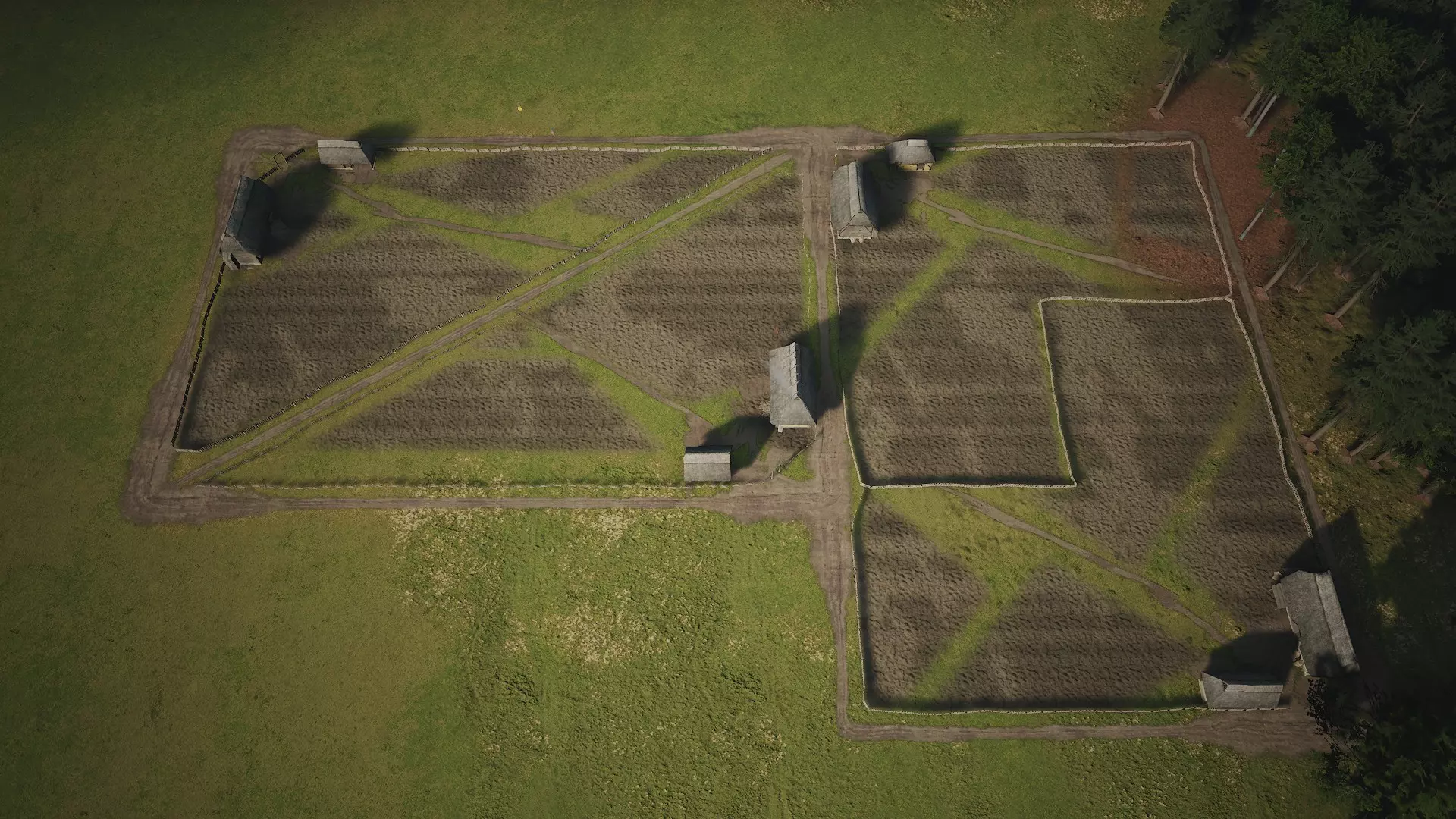 这样一来,房屋的占地面积最小,后院大部分区域都能用作菜园,而且搭建起来快速简便。过一段时间后,你完全可以凭目测来规划,不再需要依赖【尸坑】作为计量单位。这些地块的效率虽未达到最大化,但产量会远高于消耗量,因此每年都能积累可观的蔬菜盈余利润。 至于果园,规模可以大得多。单个果园最大可达6个【尸坑】的占地面积,用道路围起来,然后按此方式规划布局即可。