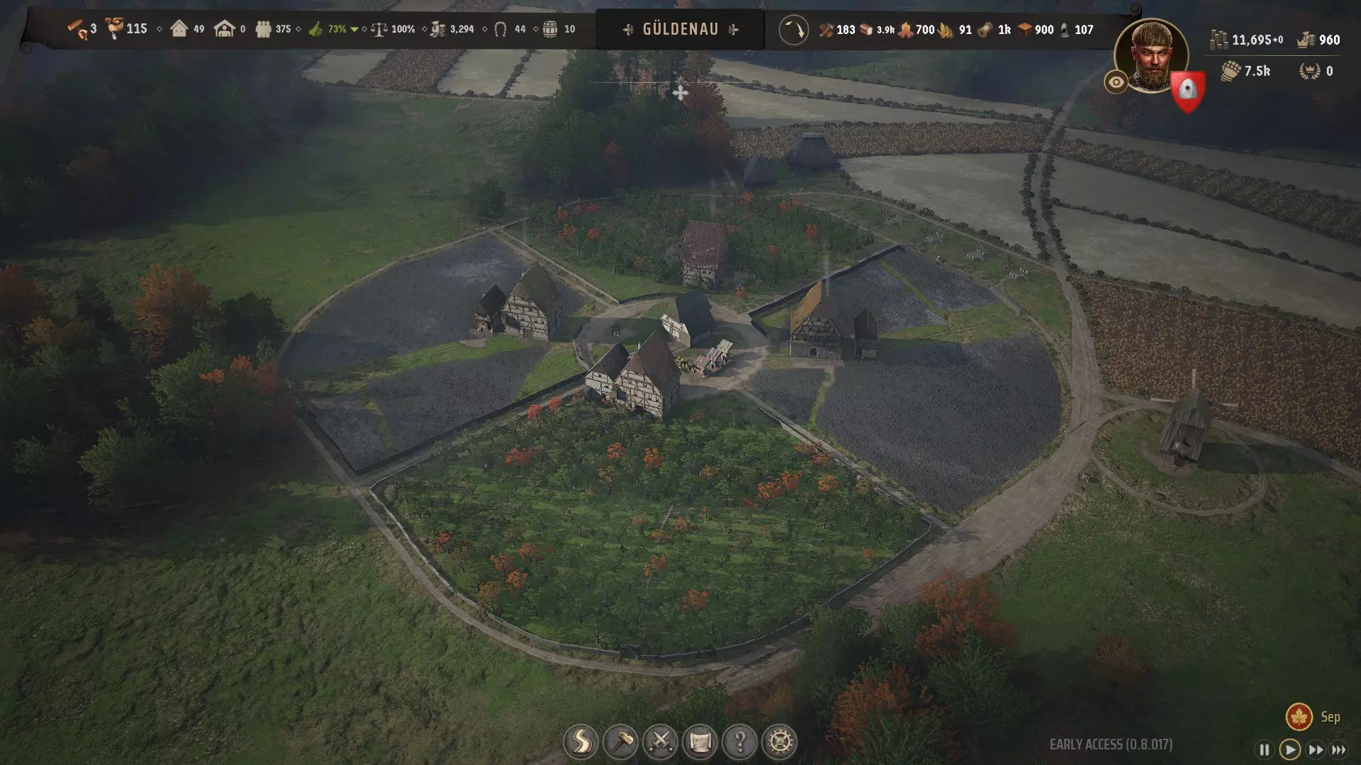 在游戏此前的0.8004版本中,这是一个低生育率区域,但拥有丰富的黏土资源和动物资源。 我发展了果园种植、黑麦种植、重型犁、后院面包房、木炭烧制和深层矿井。 苹果 你可以看到我在城镇北部建造的4个大型果园。它们的大小都大致相当于6个尸坑,即每个1.5摩根。升级到最高级的双户宅基地拥有足够的储藏室空间,可以每年收获大量苹果。对于300-500人的人口,你甚至不需要4个这样的果园,1到2个就足够了。 以下是我建造它们的方法: