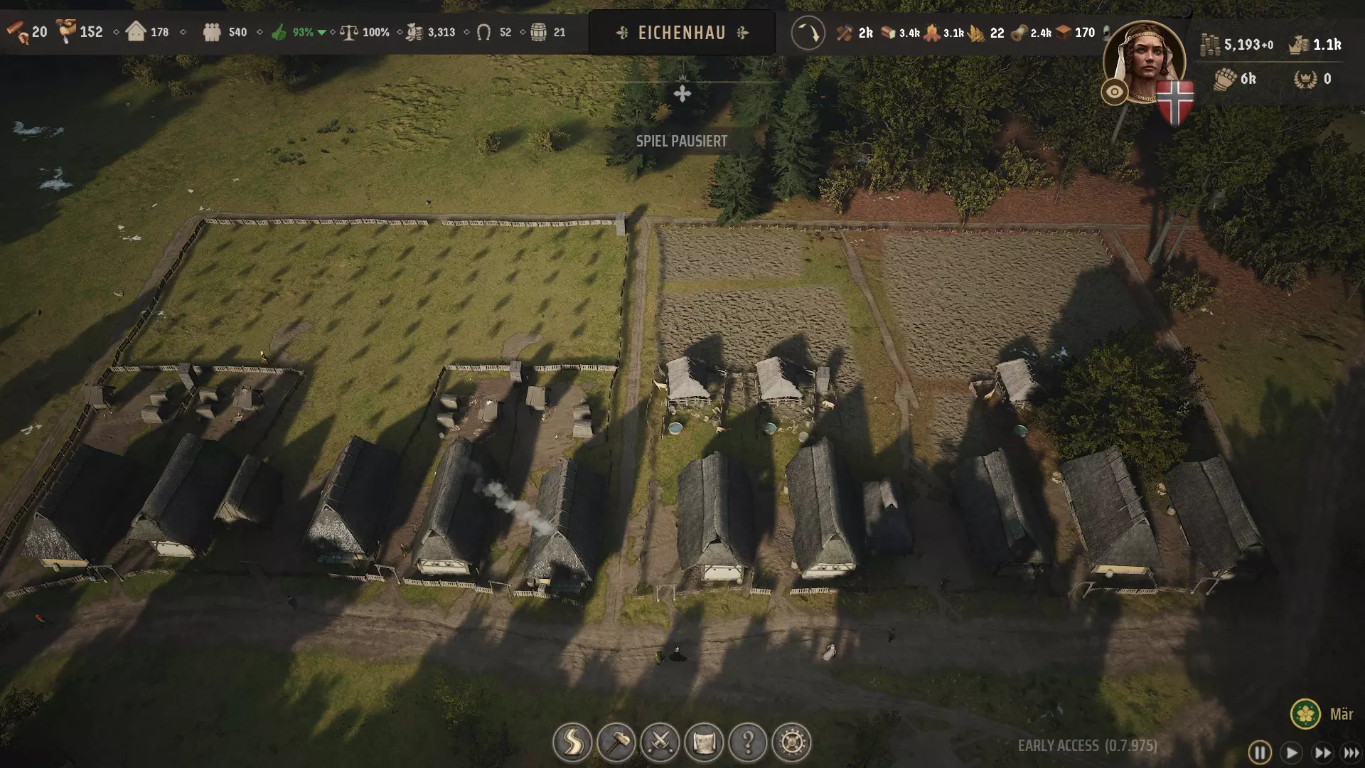5. 绵羊养殖与屠宰 这是将肉类作为主要食物来源的两种方式之一,即便你仍想种植作物制作面包。你可以选择利用丰富的动物资源点+高级剥皮技术+十几个猪圈来保证肉类供应(适用于住房等级3、人口上限500的情况),或者选择绵羊养殖。 绵羊养殖无需启用【狩猎场】政策,只需初期投入购买3-10只绵羊,并确保有足够的牧场空间让羊群繁殖,直至数量稳定在30只左右。此时繁殖率达到上限,每11天可产2只羔羊。若将 butcher 的绵羊储备设为30只、羔羊储备设为0, butcher 就会每11天屠宰2只羔羊。1只羔羊可产出2份肉类。如果没有【高级剥皮】技术,30只羊的羊群每年可产出132份肉和66张皮革。若学习【高级剥皮】,仅这些羊的肉类产量就能翻倍,达到每年264份肉。 如果还想让羊用于施肥,就需要远不止30只羊。不过不要一开始就建造大型牧场:多个小型牧场比少数大型牧场更好,因为它们总体上能容纳更密集的羊群。而且只要你的田地还没有围起来,才需要这些牧场。如果你只需将羔羊的储备上限设为0,肉类产量就仍会保持不变。 由于更大的羊群并不会带来更高的产量,因此这对于人口多得多的城镇来说,规模效应并不好。这就是为什么我一直建议把你的城镇规模控制得小一些。