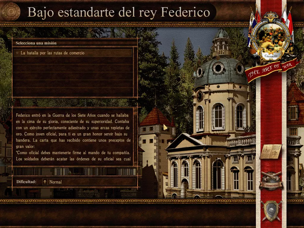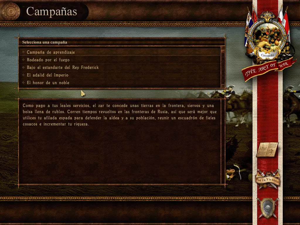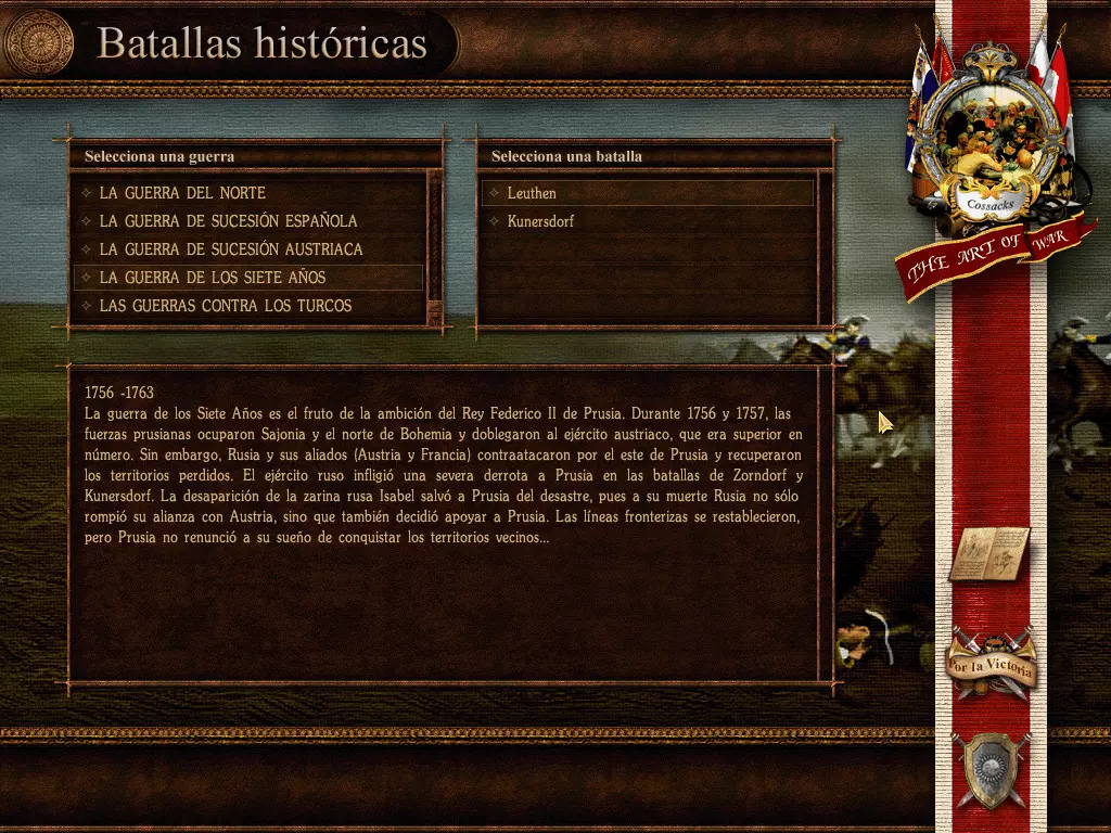 重要提示:若要解压.rar文件,您需要安装付费软件WinRAR,或者免费软件7zip,该软件能够压缩/解压多种文件格式,且与本指南中所有待下载文件100%兼容。 《哥萨克:战争艺术》汉化文件:rar格式压缩包,大小为119.6 MB,包含游戏汉化所需文件。 《哥萨克合集》手册:pdf格式文件,大小为11.5 MB,包含《哥萨克:欧洲战争》《哥萨克:战争艺术》及《哥萨克:重返战争》的西班牙语手册。如何为游戏应用翻译 重要提示:若要访问游戏的安装目录(根文件夹),请在Steam库中右键点击游戏,选择“属性”/“本地文件”/“浏览本地文件...”,这样Windows资源管理器将打开游戏的安装目录。 下载“Traducción Cossacks The Art of War.rar”文件后,只需打开该文件并提取以下内容: -文件“ALL.GSC” -文件“PATCH02.GS1” 将上述文件放入游戏安装目录,当操作系统提示时,选择合并文件夹并覆盖文件。 重要提示:游戏内的百科全书仍为英文,这是为什么呢?因为该游戏在进行西班牙语本地化时,只翻译了一小部分内容,未翻译的部分则被删除了。不过游戏内容用英语也很容易理解,而且百科全书中的大部分内容,都在本指南所包含的游戏手册以及游戏中各单位、建筑的描述里有说明,这些描述在游戏过程中都可以查看,正如指南中的最后一张截图所示。 不同操作系统下的问题与兼容性