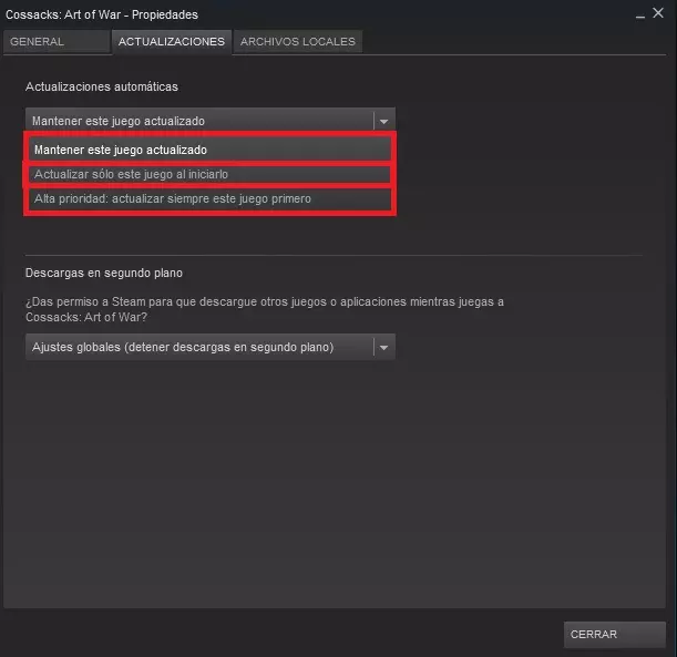 保持此游戏为最新状态。 每当有新更新发布时,Steam会在任意时刻自动下载并应用更新,例如打开Steam时,就会开始下载最新更新。 仅在启动时更新此游戏。 与上述选项类似,但仅会在启动游戏时进行更新。 高优先级:始终优先更新此游戏。 如果有多个游戏有待更新,所有选择此选项的游戏将优先于其他游戏,即它们的更新会比未选择此选项的游戏先下载。