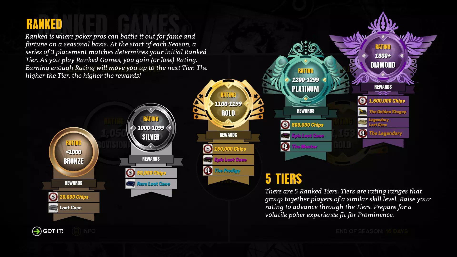【赌场总管】:在任意阵营中达到5级 排位赛 在主菜单中,点击【寻找游戏】,选择【排位赛】,再选择【锦标赛】或【一对一】,进行你的第一场排位赛。你需要一直玩到获胜或失败/被淘汰为止。