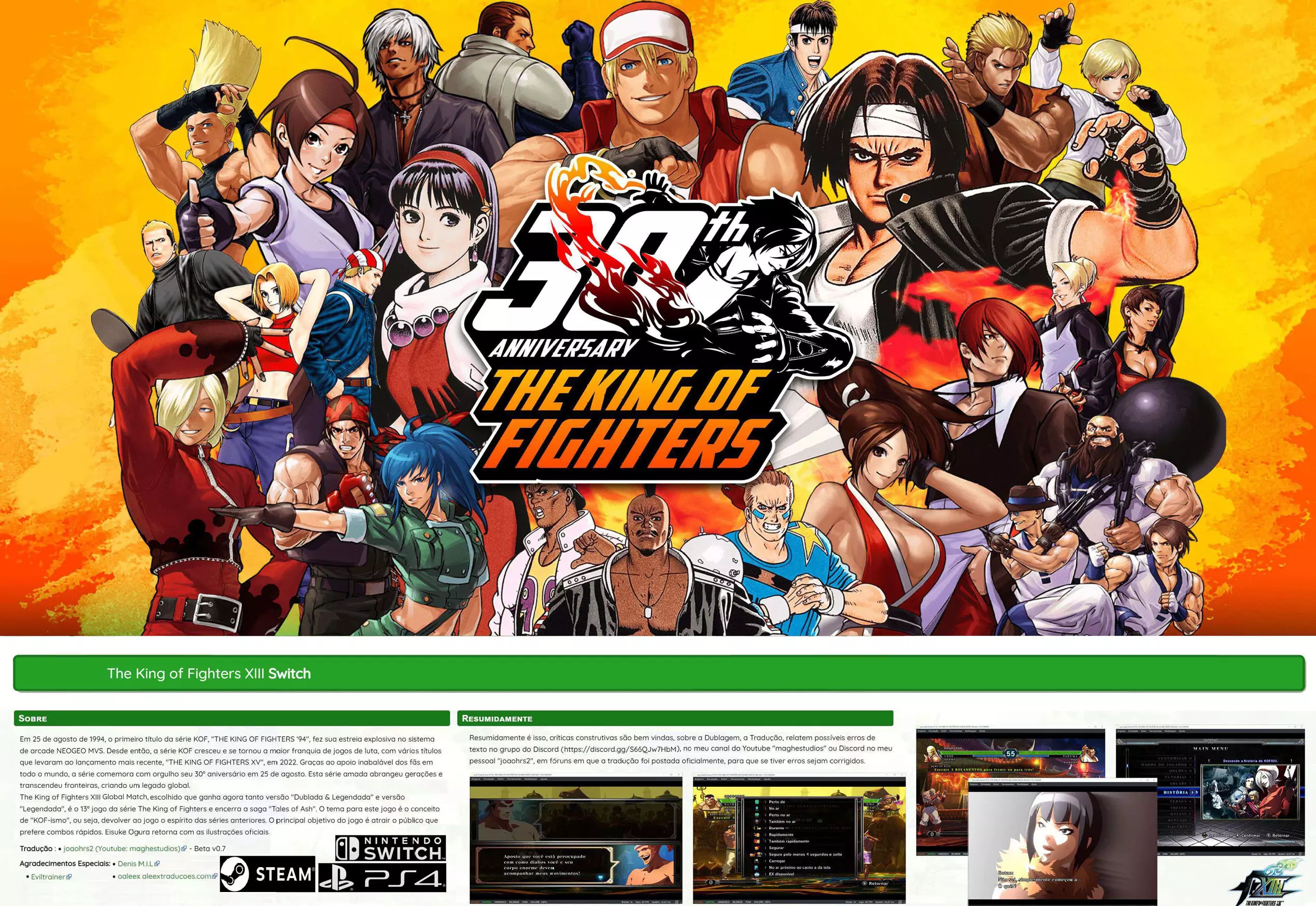 【视频】 《拳皇XIII 全球对决》PC/STEAM版翻译与配音测试版v0.7链接 测试版v0.7: 注:链接在视频中。 包含内容: - 游戏全部内容翻译为葡萄牙语。 - 街机模式/故事模式所有场景及结局的配音。 即将推出v0.8版本,将包含游戏纹理翻译;v0.9版本将为部分格斗家的招式、旁白台词及更多音频进行配音。由于内容包含引导订阅及外部链接,根据规则已进行屏蔽处理,无符合要求的可输出内容。