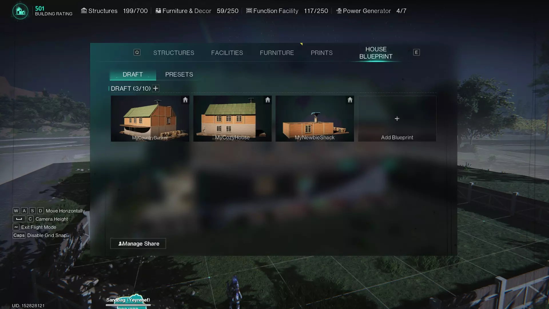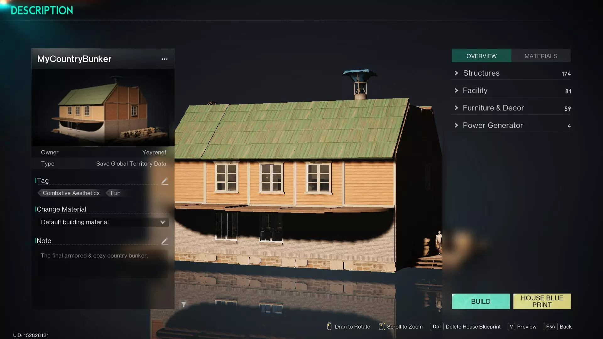 嘿,我可从没说过自己是建筑大师 ; ) 按B键进入建造模式,然后点击鼠标右键打开建造菜单。如你所见,最后一个标签页是【房屋蓝图】,这个选项可以保存/保护你的整个建筑。 记住:保存的是建筑本身,而不是你储存在箱子或冰箱等其他储物单元里的所有物品。 另外值得注意的是,这和移动领地的操作类似:所有放置在地基上的东西都会被保存(或移动),但直接放在地面上的物品不会包含在蓝图中。就像移动领地时一样:那些“零散部件”会被移除,你会获得相应的资源返还。 制作蓝图很简单:只需点击【添加蓝图】选项即可。系统会询问你是保存所有内容还是仅保存单个建筑;此选项仅在你将建筑拆分为多个部分时有用。若不确定,只需选择【全部保存】以包含你的完整领地及领地内的所有角色。