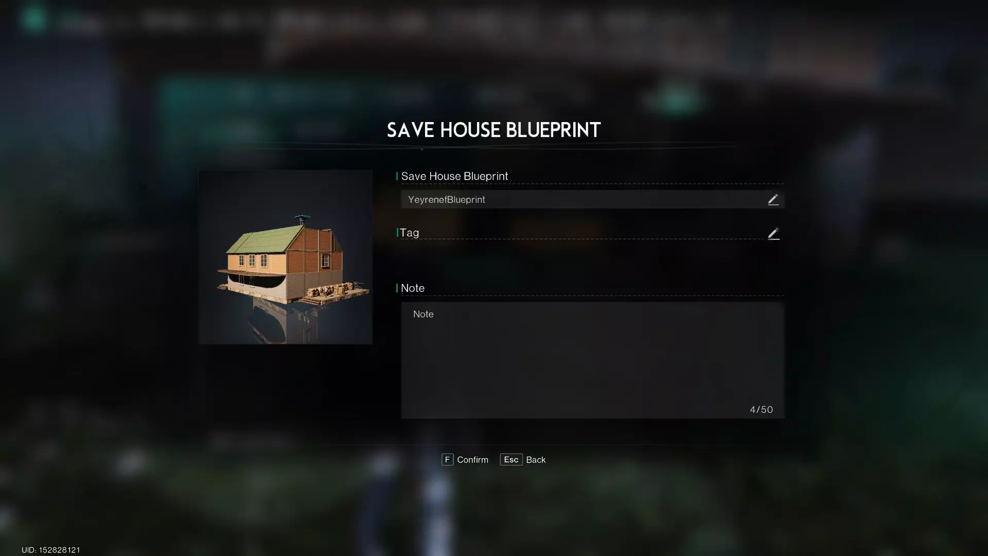 将我的房子保存为蓝图…… 如你所见,操作十分简单:只需为其命名,还可以选择添加标签和描述。确认后,你的建筑就会被完整保存。 再次提醒:你仅保存建筑本身,不包括任何内部物品! 使用蓝图(重新)建造房屋 现在,回到【永恒大陆】! 找一个合适的位置放置房屋,进入建造模式,然后在建造菜单中再次打开蓝图标签页。不过这次,我们要点击想要放置的蓝图。