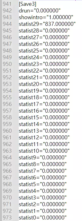 再次以守护者职业为例,请看截图。 subclasspst10="1.000000"指的是拥有1级声望的防暴守卫(首次声望提升后不会再获得其他奖励)。 以下是每个职业对应的代码行: subclasspst10 subclasspst11 subclasspst12 subclasspst20 subclasspst21 subclasspst22 subclasspst30 subclasspst31 subclasspst32 subclasspst40 subclasspst41 subclasspst42 初始状态下,它们会显示为subclasspst##="0.000000"。将每个代码行中的数值改为subclasspst##="1.000000",即可为每个职业提升1级声望,从而获得属性加成。 挑战/疯狂难度遵循相同规则: ski##="0.000000" > ski##="2.000000" sad##="0.000000" > sad##="2.000000" sta##="0.000000" > sta##="2.000000" sma##="0.000000" > sma##="2.000000" scl##="0.000000" > sci##="2将它们的值更改为右侧的值将解锁挑战/疯狂难度的奖励。 注意:两个##只是将要出现的数字的占位符。 每日挑战和作弊码重置 解锁每日挑战研究后,你就可以顾名思义地进行每日挑战,但每天只能进行一次。要重置它并进行另一次挑战,请按Ctrl+F并在搜索栏中输入/粘贴Save3。 这将带你到这里。