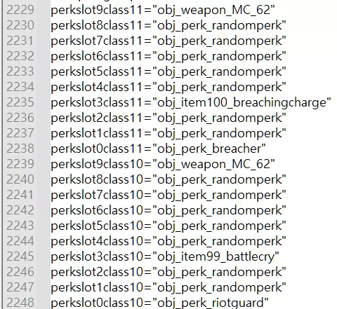 使用什么文本编辑器 可以使用默认的记事本。我个人使用Notepad++,所以我提供的截图与你自己编辑时看到的界面会有视觉差异。 编辑职业配置 我将以守护者职业为例。其他职业除了perkslot0class和perkslot3class行之外完全相同。Perkslot0是职业核心,Perkslot3是特定职业的初始物品。 目前,我没有选择任何物品或 perk,所以每行都显示为obj_perk_randomperk。Perkslots4到Perkslot7是游戏中你选择的物品和模块的显示位置。Perkslots6和7是模块的显示位置,同样,Perkslot4和5是游戏中选择物品后的显示位置。