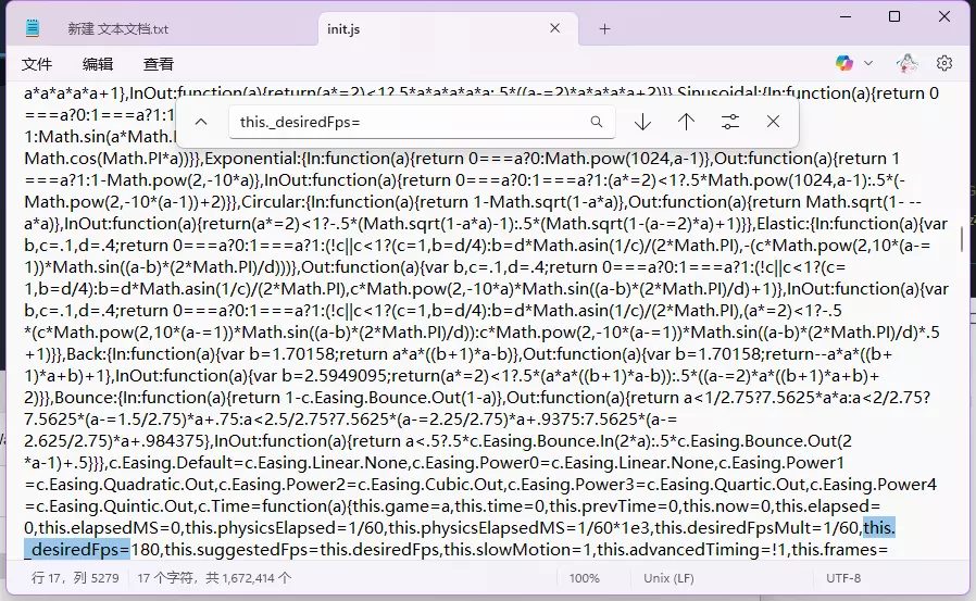 第二种办法(不推荐) 在游戏根目录中 Fireboy & Watergirl Elements/resources/app/www/js/ 找到init.js文件 用记事本打开并搜索(ctrl+f)this._desiredFps=60 如图所示