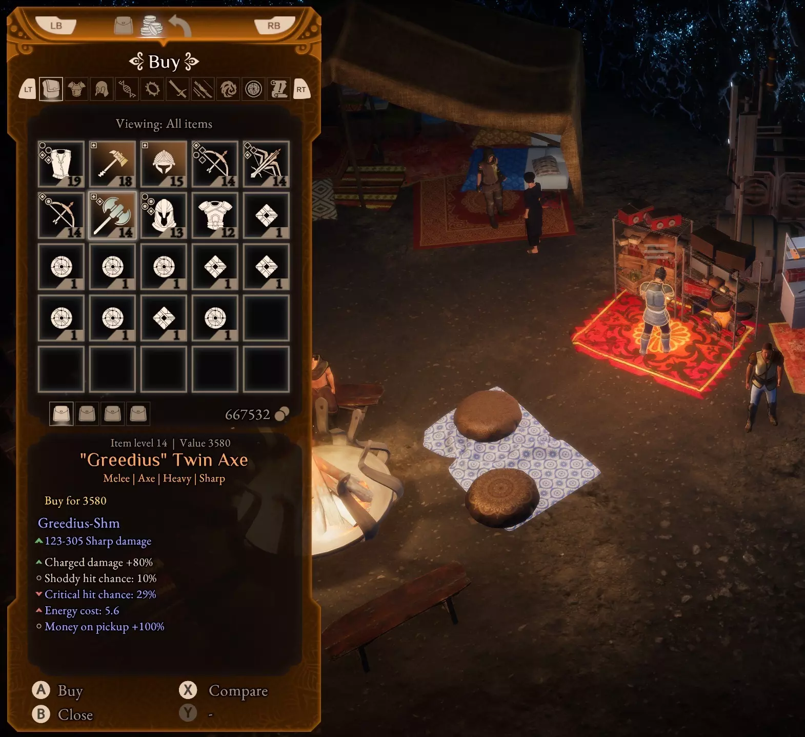 第二步! 使用快速旅行点【Aatma - Vantage Point】前往【Mountain Pass South】。沿着山脊前进,直到找到【Scavenger Cave】。洞穴内有一名商人,他总会出售一把带有【Greedius】变体的双手斧。购买后,通过快速旅行到【Quilon - Dayla Home】,然后再返回【Aatma - Vantage Point】来重置商店库存,以便再次购买。 注意:你可能需要完成一个非常简短的护送任务才能进入这家商店。在提供的图片中,前往右下角的红圈处。那里应该有一个NPC,护送他回到洞穴即可解锁商店。