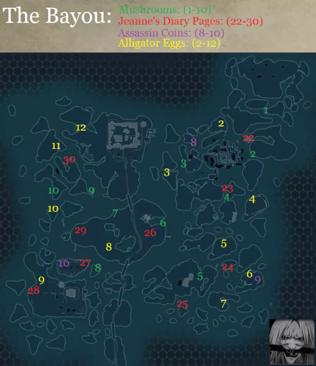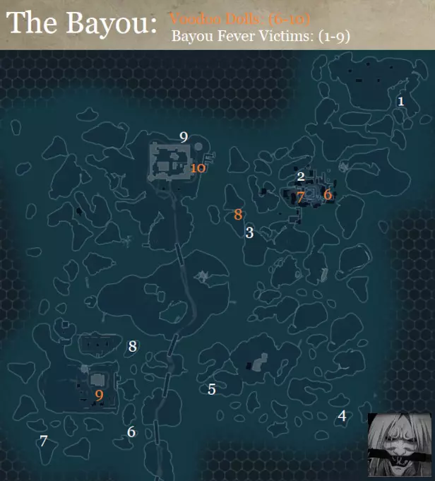 成就#19 - 灵魂收集者: 要达成此成就,你需要以杀手人格收集全部10枚杀手硬币,以夫人人格收集全部10颗宝石(镶嵌宝石的代币),以奴隶人格收集全部10个巫毒娃娃。 河口热症受害者#1-9:你很可能在以杀手人格探索时已经找到了其中几个,但如果你仍缺少部分,以下是它们的位置。你只有在之前收集到所有蘑菇后才能治愈它们。