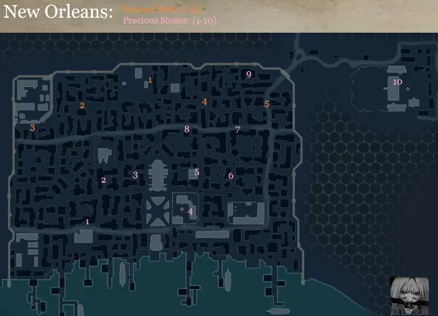 成就#9 - 完成序列#4。 与剧情相关。从倒塌的教堂中逃脱并遇见过去的灵魂。 序列5:我低语道:不 1. 地点:新奥尔良 2. 序列#5 回忆:1 3. 契约:5/5 4. 船员:1/3 5. 商业竞争对手:2/7 6. 可选目标:28/59 7. 怀表:2/10 8. 玛雅雕像:9/10 9. 鳄鱼蛋:1/12 10. 刺客硬币:7/10 11. 珍妮的日记页:21/30 12. E市民:3/6 13. 成就:11/30 ----------------------------------------------------------------------------------------------------- 序列#5: 新奥尔良: 回忆#1 - 挥霍的女儿:在取回我们的装备后离开刺客总部,并找到西班牙招募者。当我们找到他时,跟随他,直到他逃跑并躲藏在当地堡垒中。 新奥尔良 - 收集品:在进入序列5之前,值得收集当前可获取的收集品。在新奥尔良探索时记得查看这张地图,你还可以完成一些新的支线任务。