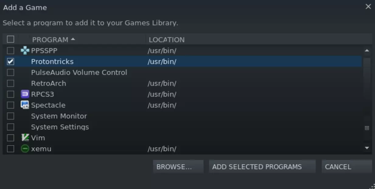 选择Protontricks并点击“添加所选程序”