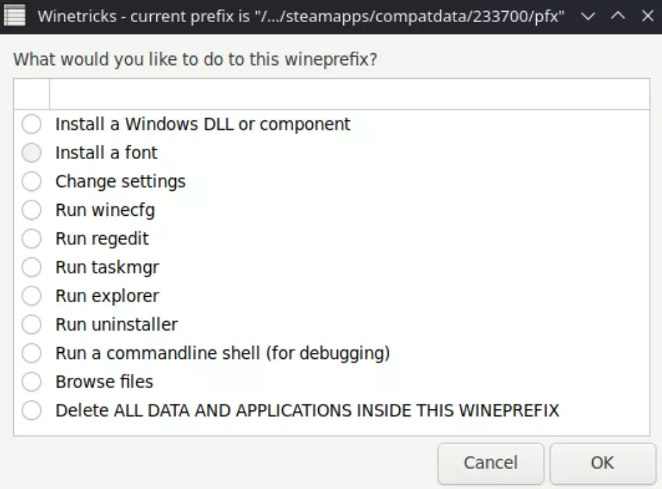 点击上述窗口中的关闭,然后在接下来的窗口中点击“取消”以关闭Protontricks。 从Steam重新打开Protontricks。 ============================================================== 继续操作前关于Protontricks的注意事项 开始使用Protontricks前: 你在Protontricks中执行的各个步骤将需要很长时间来运行。有时可能几分钟内没有任何反应,但Protontricks正在后台运行。你可以通过检查它是否仍在Steam中运行来确认这一点。