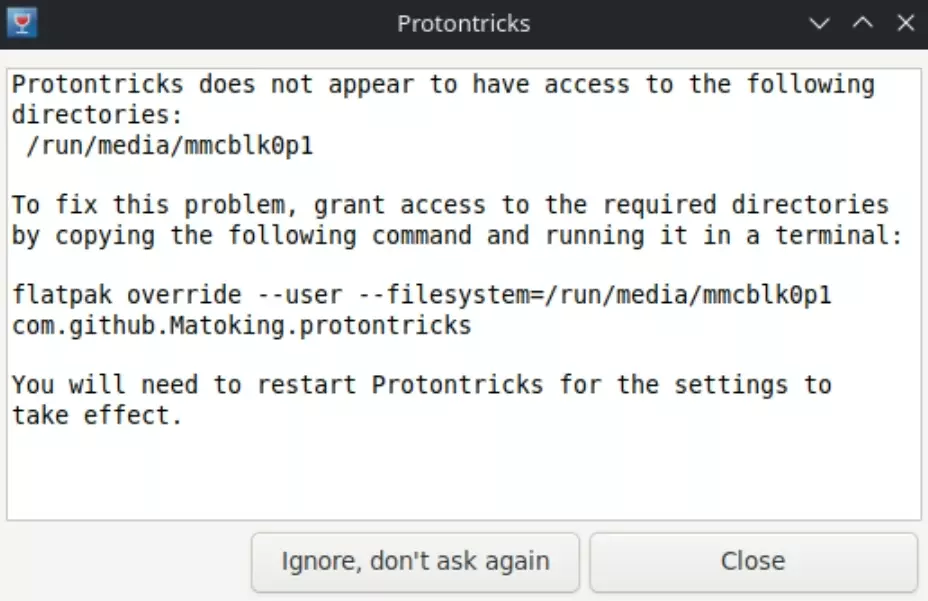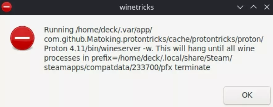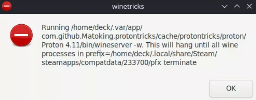 在按照本指南的其余步骤操作时,Protontricks 会显示很多如下错误。你可以忽略这些错误,只需按确定即可。