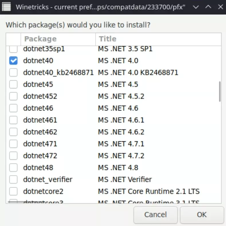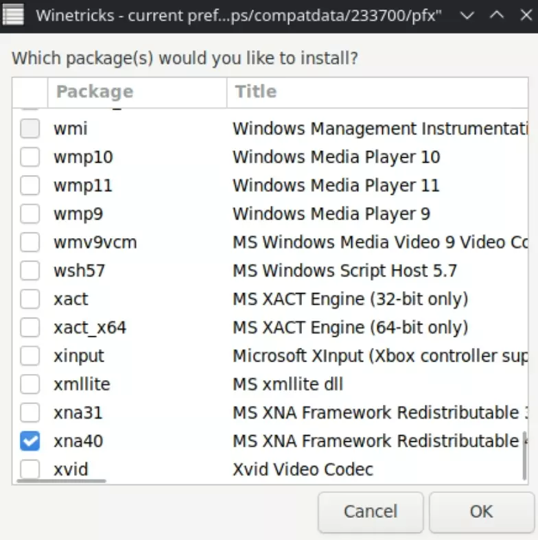 将dotnet40和xna40安装到默认的Winetricks前缀中 当提示选择要安装的软件包时,选择【dotnet40】和【xna40】并点击确定