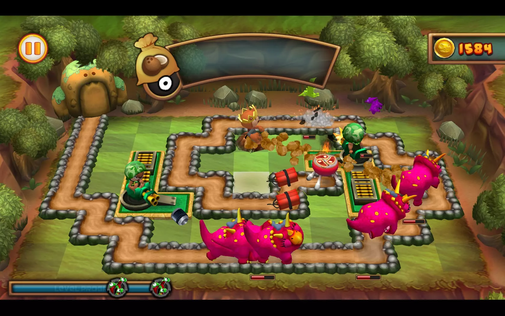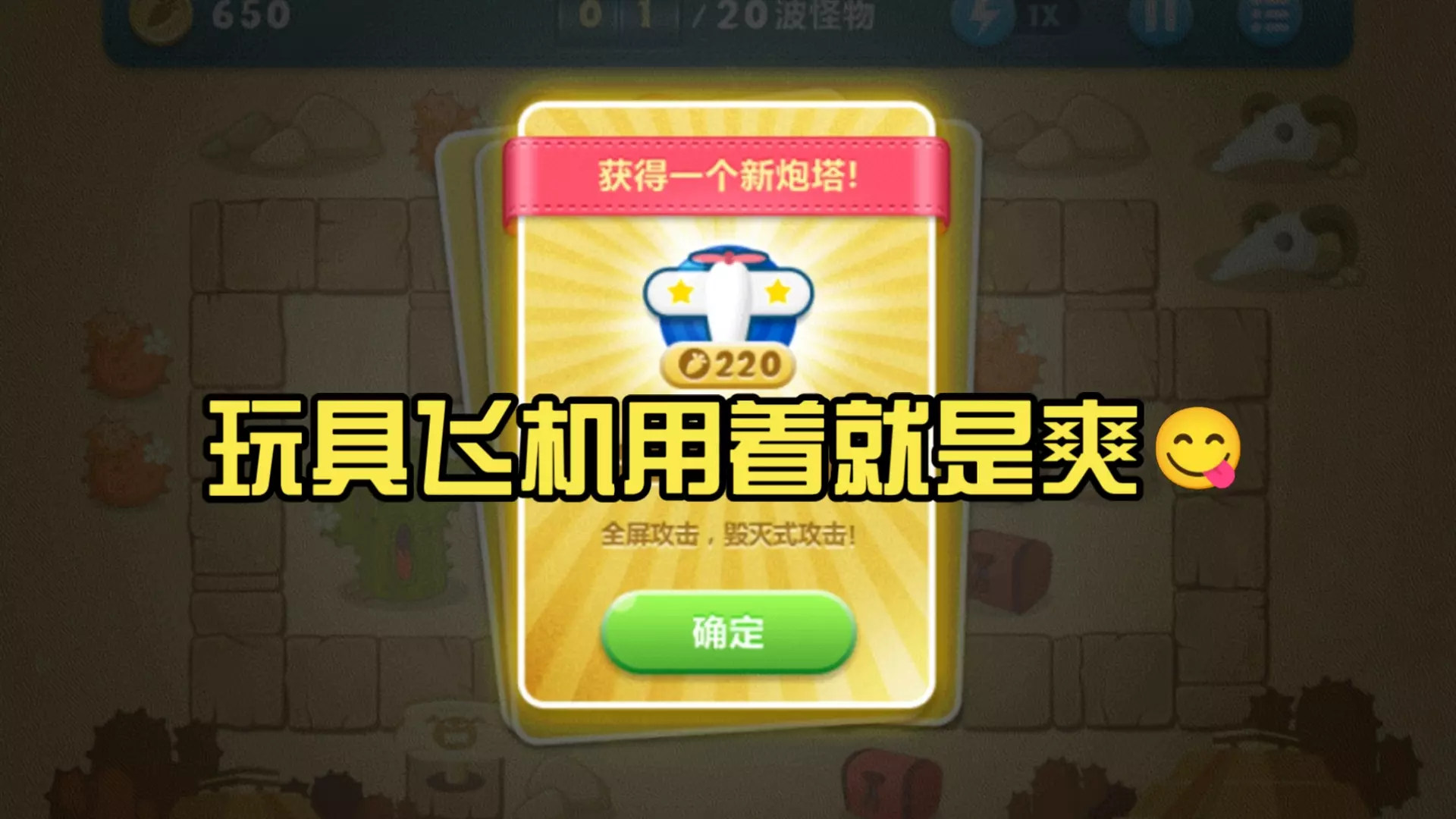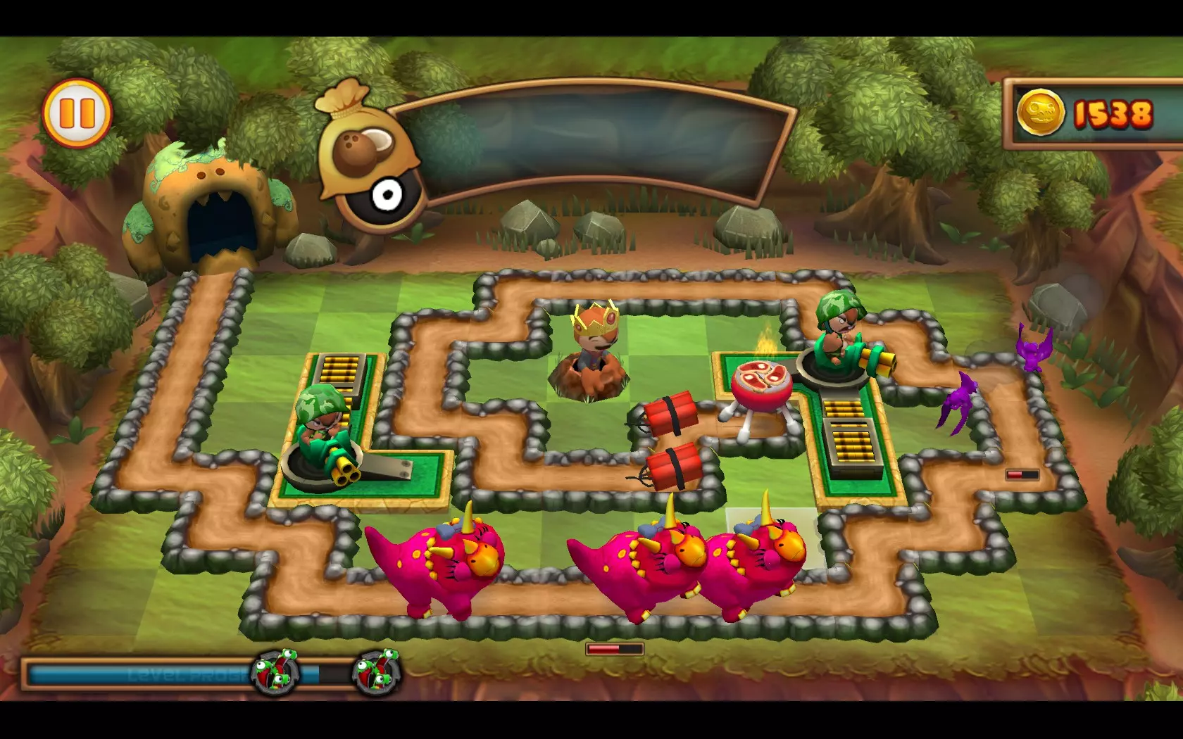 关于【Powerful Pair】成就的图文简易指南 简介 本指南将展示如何获取【Powerful Pair】成就。要获得该成就,你需要仅使用2张卡牌以三牛排评价完成1-19关卡。三牛排评价指的是在关卡结束时保持所有三块牛排完好无损。 方法 为了获得【Powerful Pair】成就,我们必须仅使用两张卡牌,以三牛排评价完成1-19关卡。注意,是仅使用两张卡牌,而非两种类型的塔!有多种解决方法,这里将展示其中最简单的一种:使用2张【中士快射手】卡牌。 开始时收集椰子,并跟随第一只恐龙进行射击。消灭两只飞行恐龙,它们并不难缠。当你收集到6个椰子时,放置第一个【快速射击中士】,如下图所示。