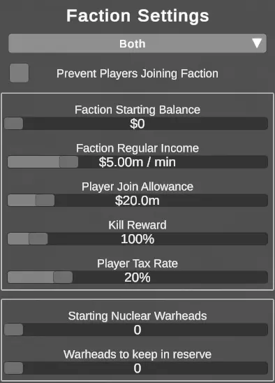 阵营选择下拉菜单 - 更改正在编辑的阵营(双方/博斯卡利/普里梅瓦) 阻止玩家加入阵营 - 若勾选,将不允许玩家加入该阵营 阵营初始资金 - 阵营可分配给玩家的资金(?) 阵营常规收入 - 分配给阵营并由所有玩家共享的资金(?) 玩家加入津贴 - 玩家加入阵营时获得的资金 击杀奖励 - 玩家每击杀一名敌人获得的资金(1m = 1分) 玩家税率 - 从击杀奖励中扣除并交给阵营/分配给队友的资金百分比 初始核弹头 - 阵营初始拥有的核弹头(后续可通过浓缩工厂增加) 需保留的储备弹头 - AI为玩家保存的弹头数量