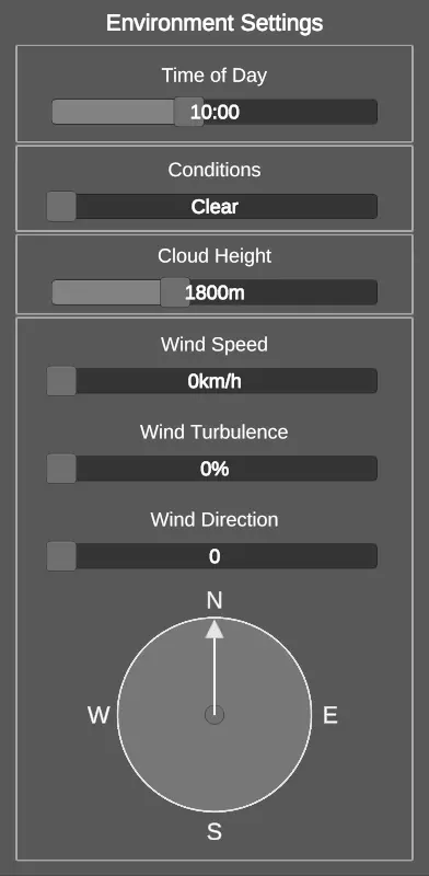 时间设置 - 更改起始时间;时间以1:1的速度自动流逝 天气条件 - 更改天气(不影响风力),可能的天气选项包括: 晴朗 - 少量无阴影的云 零散云 - 少量带阴影的云 多云 - 中等数量的云,伴有较多阴影 阴天 - 大量云层,天空完全被遮蔽,地面全部处于阴影中 雷暴 - 大量乌云,天空完全被遮蔽,地面全部处于阴影中;偶尔会有闪电 云高 - 决定云生成的高度;若要完全移除云,可将此值设置为0以下json编辑 风力 - 决定多个风力参数的值: 速度 - 风的吹拂速度 湍流 - 飞行器在风中的摇晃程度 方向 - 风的来向 高级任务设置(限制条件;道路) 限制条件选项卡