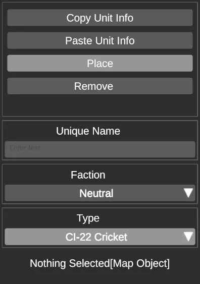 复制单位信息 - 复制所选单位的数据(飞行器复制装备配置和速度;水面载具复制技能和保持位置;工厂复制生产单位和生产速度) 粘贴单位信息 - 将数据粘贴到所选单位 放置 - 放置所选的单位类型,该类型在“类型”中定义 移除 - 移除所选单位 唯一名称 - 所选单位的唯一名称;用于任务目标 阵营 - 所选单位的阵营 类型 - 单位类型;放置单位前需更改此项(例如:CI-22 蟋蟀;AFV8 装甲运兵车;碎片级护卫舰;大型工厂)
