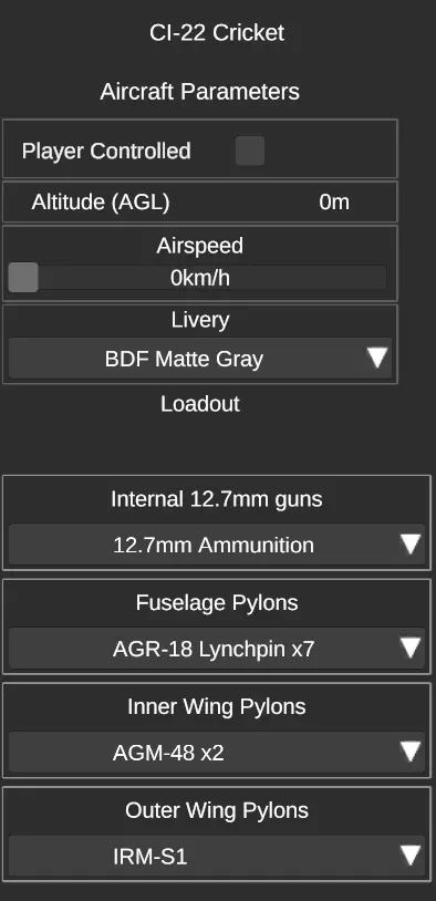 选择飞行器后显示的菜单 玩家控制 - 勾选后,飞行器生成时将由玩家控制;若存在多架可驾驶飞行器,玩家将按放置顺序依次占用 空速 - 飞行器生成时的前进速度;若飞行器在空中,建议将其设置为高于失速速度;若在地面,则建议设置为低于20千米/小时 涂装 - 设置飞行器的涂装 武器配置 - 决定飞行器的初始武器配备