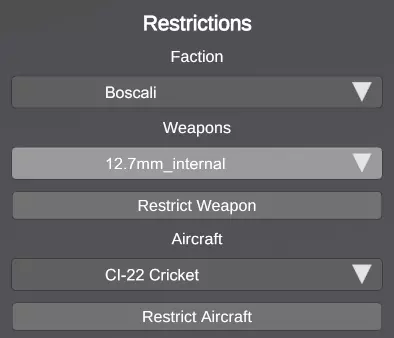 阵营 - 更改已选择的阵营 武器 - 允许为已选择的阵营限制特定武器;可限制武器分为内部和外部变体 飞行器 - 允许为已选择的阵营限制特定飞行器 道路选项卡