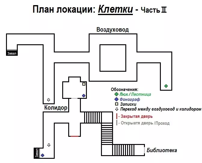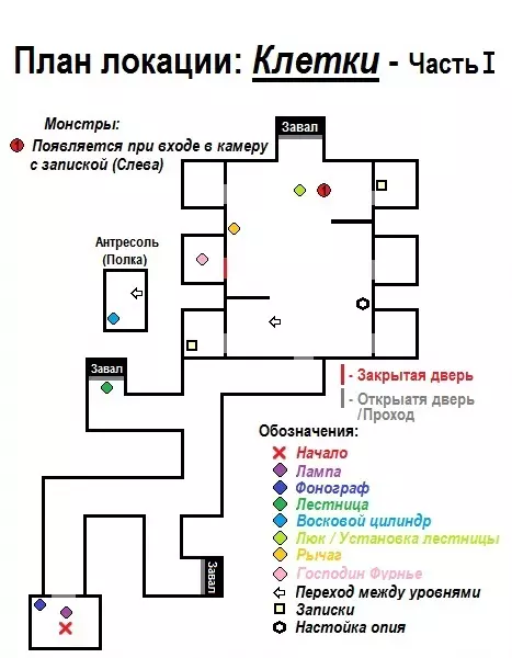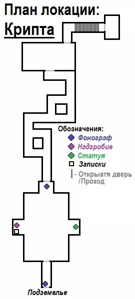 ⚰️ 关卡:地窖 + 地图️ 地窖是最后一个游戏关卡,也是最简单的。在地窖中,我们从出现的走廊开始前进。走出布满泥土的巨大房间后,直接进入下一条走廊(你可以探索这个房间,它很大,但有趣的地方只有几处)。走廊可以朝任意方向跑,结果都一样——通向隔壁房间的门,开发者会在那里为我们展示一小段演示。之后穿过位于房间右上角的门,沿着楼梯向上走,即可结束游戏。 关卡地图:【地穴】(第四个游戏场景)