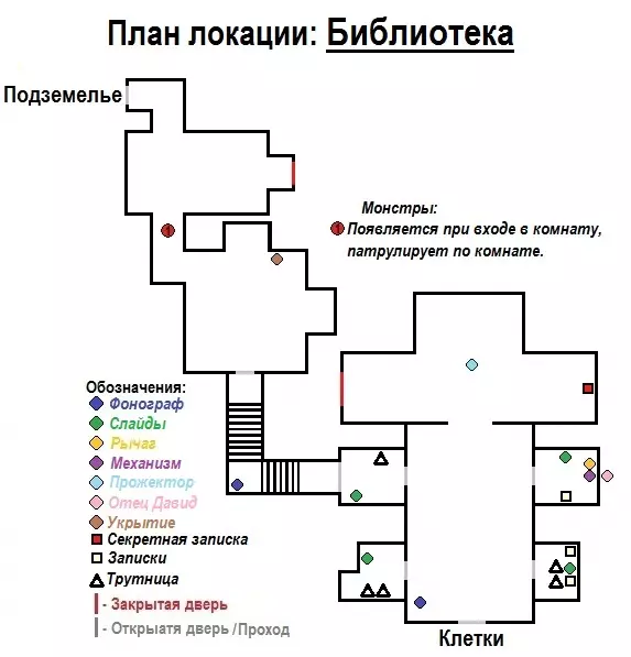 关卡:图书馆 + 地图 从“地牢”区域进入“图书馆”区域。在该关卡中,我们需要找到4个幻灯片,它们分别位于不同房间内。找到幻灯片并不困难,但需要思考与幻灯片相关的谜题(你可以使用下方的区域地图来寻找幻灯片)。找到所有幻灯片后,需要从4张幻灯片中选出2张所需的,然后将它们插入到特殊装置中(该装置位于其中一个房间的墙壁内,在地图上以紫色标记)。如果你决定自行解开幻灯片谜题,那么需要在投影仪(地图上以蓝色标记)上查看所有幻灯片,散落在各个房间的笔记将帮助你解开谜题。如果没有时间或不想解谜,可以直接查看谜题答案:需要将编号为4和3的两个滑块插入机械装置中(滑块的顺序将决定机械装置后被囚禁者的生死:上方插槽插入4,下方插槽插入3,囚徒就能存活;反之,上方插入3,下方插入4,囚徒就会死亡)。启动机械装置。如果使用了正确的滑块,对面房间就会打开一扇通往走廊的暗门(书架)。穿过走廊,进入一个大房间。之后立刻从门口朝相反方向跑,柱子后面会有大箱子,躲到箱子后面。等待怪物出现,等它经过身边后再行动。然后起身,悄悄溜到它出现的地方,转弯进入黑暗的房间。在这个房间里,你面前会有一条通往新地点【地下城】的走廊。(总之使用潜行,避开怪物并不难) 关卡地图:【图书馆】(第二个游戏地点)