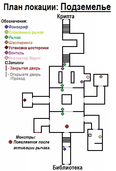关卡:地下室 + 地图 在“图书馆”之后,我们会进入“地下室”区域,具体是通往被淹没房间的走廊。我们需要打开右侧的门,穿过走廊进入房间,桌上放着一个损坏的拉杆。带着拉杆回到初始房间,将其安装在紧闭的门旁(安装好拉杆后,建议大家加快速度行动,不停地奔跑)。激活拉杆,进入下一个房间,然后用门边的另一个拉杆关上身后的门。在我们现在所在的这个房间里,需要走进右侧的门,穿过走廊进入有齿轮的房间。拿起齿轮后返回。对面有一扇门(左侧),我们带着齿轮冲进这扇门。穿过走廊,进入安装齿轮的装置所在的房间。安装好齿轮后回到主房间。现在我们可以用拉杆打开那扇锁着的门。打开门,进入新的被水淹没的房间,然后用另一个拉杆关上身后的门。对面会有另一扇关着的门。跑过去,使用阀门来开门。打开门,进去后用拉杆关上身后的门。我们来到了走廊,任务就是穿过走廊到达新的地点。 关卡地图:【地下城】(第三个游戏场景)