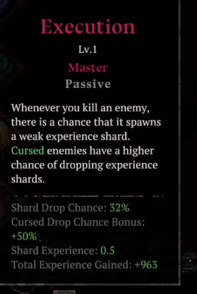 处决……海量额外经验,无需多言,经验越多,就能在精灵出现前更快提升技能等级。