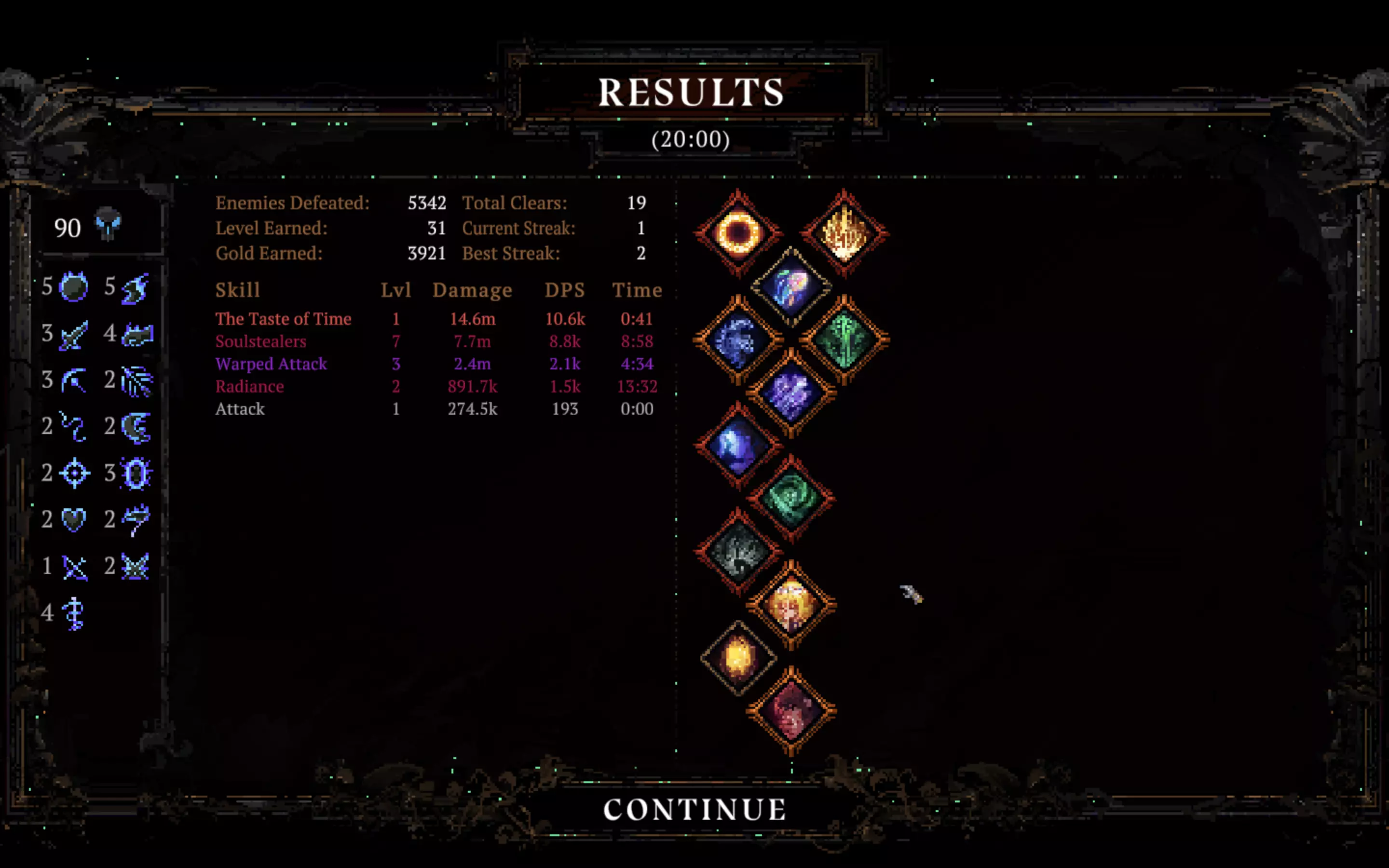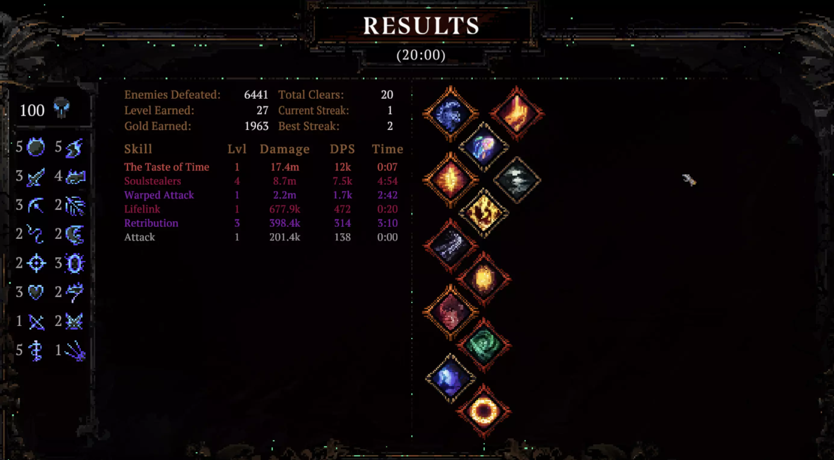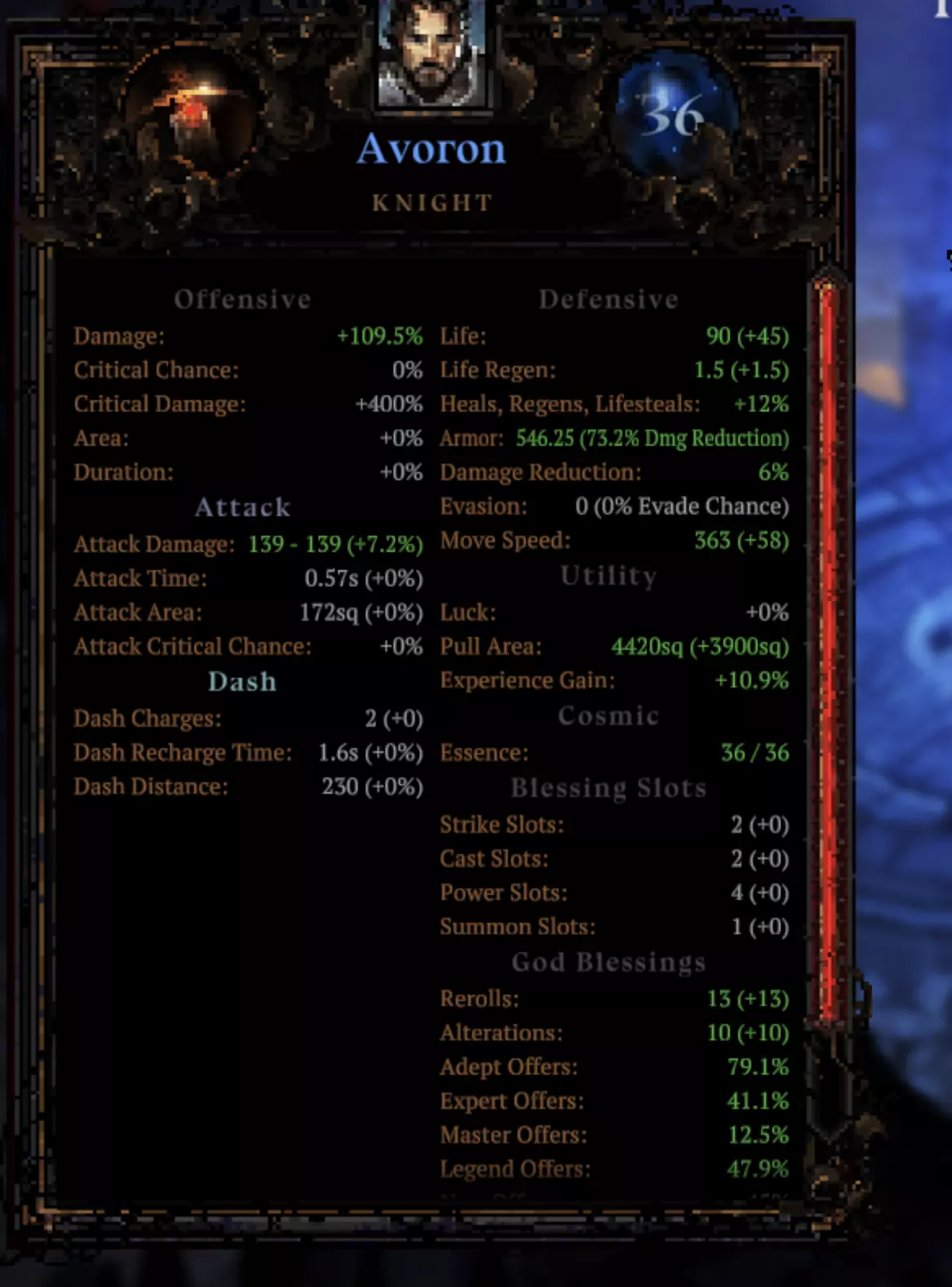 如你所见,只有这两个技能造成了伤害,一个是传说技能,另一个是【灵魂窃取】大师技能。盔甲和吸血效果帮助生存,经验值则能快速提升等级,其他的都没用。角色、技能、参数,我的属性。