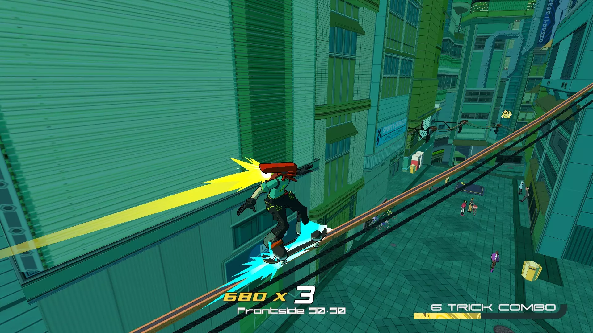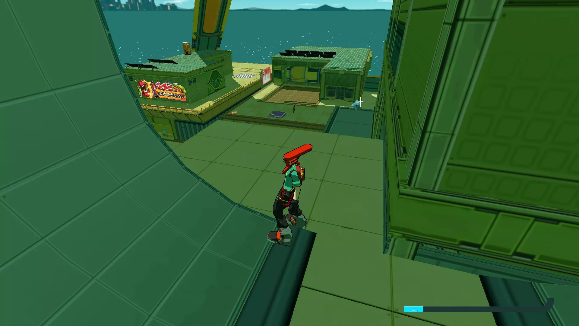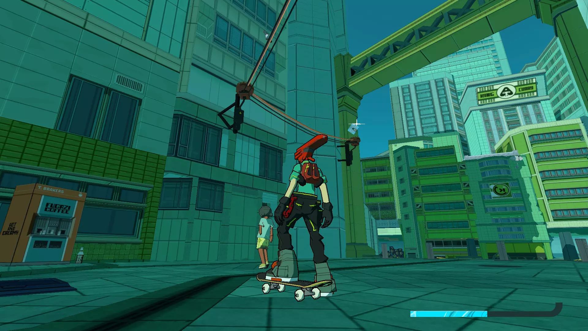放克快递 - 普鲁克斯 在移动公牛的角上滑行后,看向接下来街道的右侧,你会看到空中有一张CD。使用半管坡道去获取它。