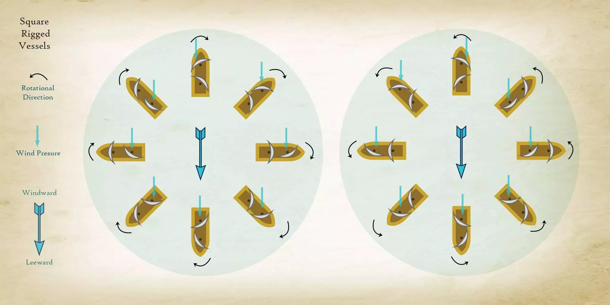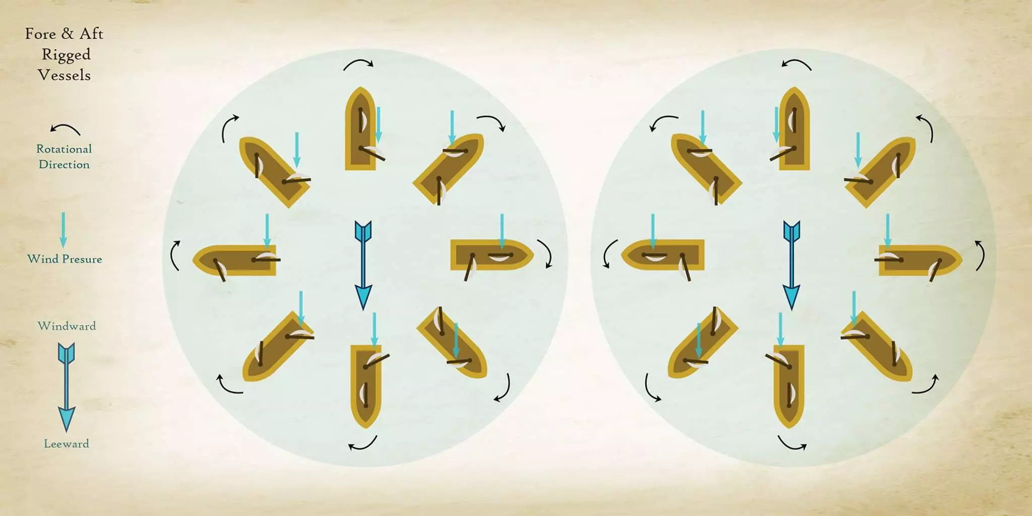 这份指南将帮助你在战斗模式下更高效地操控船只。 一切都非常简单: 要从自动帆控制模式切换出来,需按下以下任一按键:【q】、【e】、【z】、【c】。"q" - 前帆向左转 "e" - 前帆向右转 "z" - 后帆向左转 "c" - 后帆向右转 以下图片展示了如何根据风向高效调整船帆以实现顺时针和逆时针转向: - 适用于普通船帆