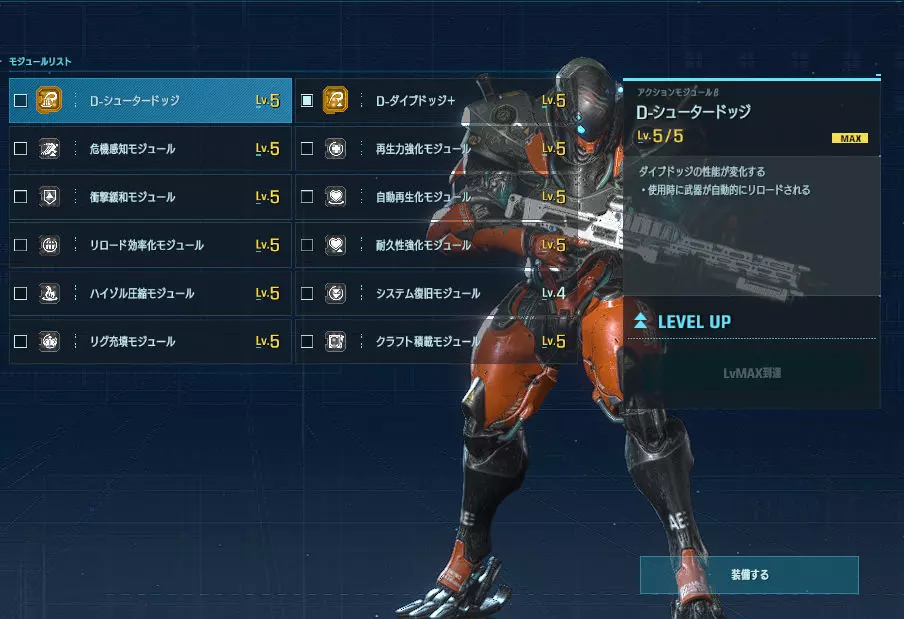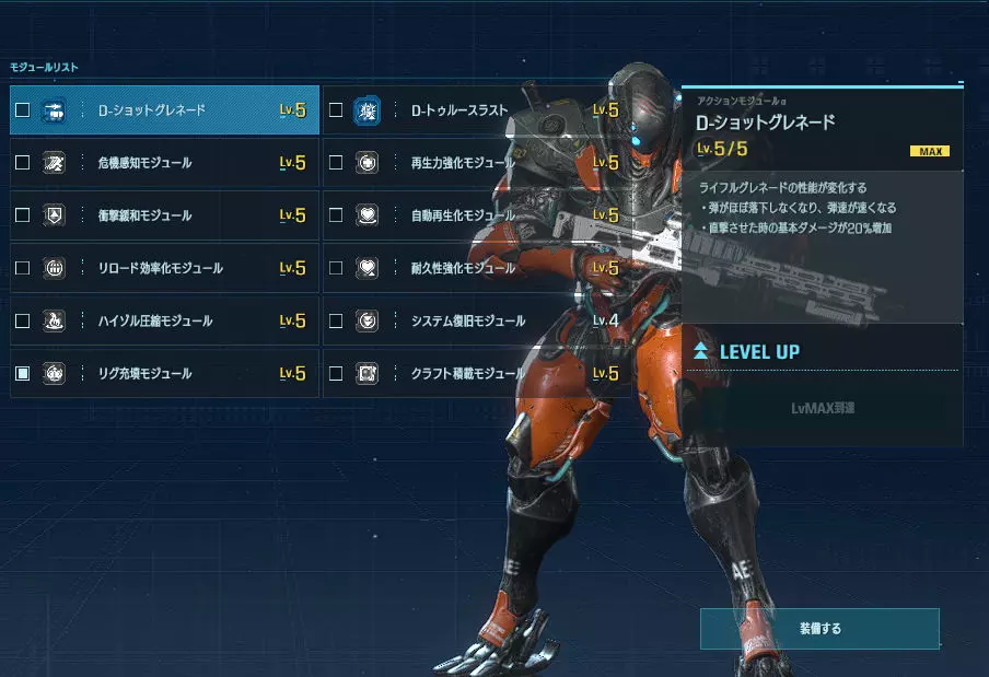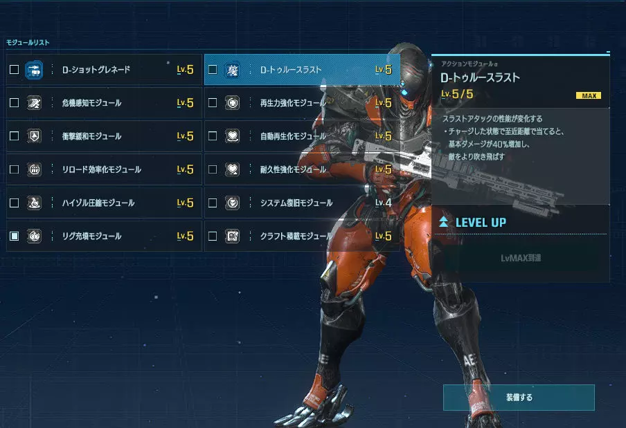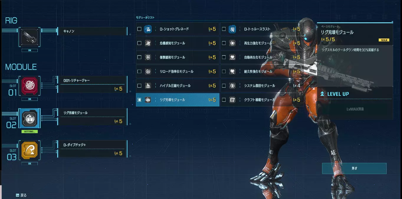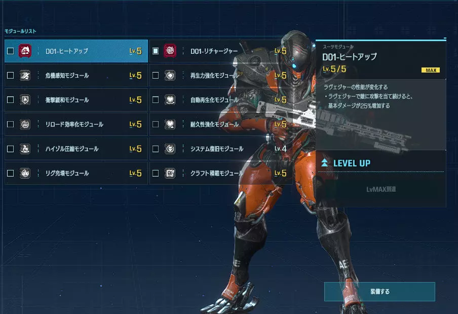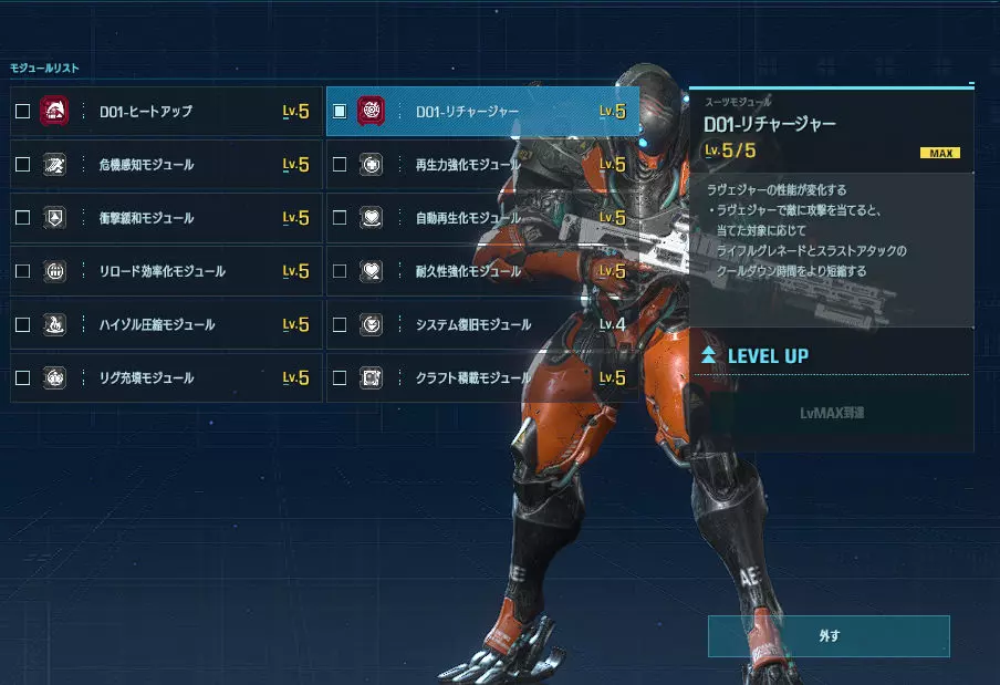 优点:范围攻击、中距离射击、回避技能、近距离战斗样样精通的全能型角色。 缺点:无论好坏,虽然具备全面且较高的应对能力,但反过来讲,在各特化套装的专业领域中必然稍逊一筹。 主武器【拉维杰尔】:以单体击杀为设计目标的突击步枪。相比β版,距离衰减有所缓和,因此即使在中距离及更远的距离也能进行战斗。也能作为牵制手段发挥作用。 准星虽有一定扩散,但中距离内仍能命中;进入瞄准状态后,可稳定持续命中头部。 虽是全自动枪械,但通过所谓的点射,既能避免准星上下晃动的困扰,又能减少因子弹散布导致的浪费。根据不同情况灵活运用,其发挥空间将会更大。 【专用模块介绍】 【过热充能】