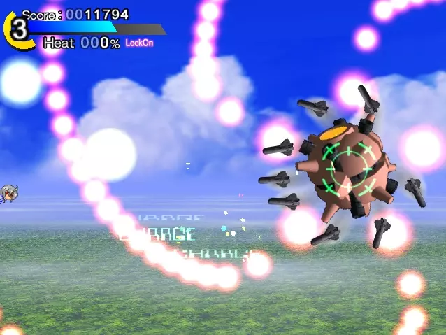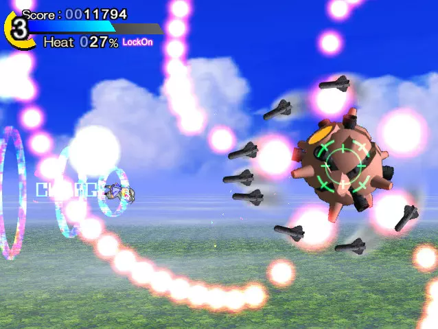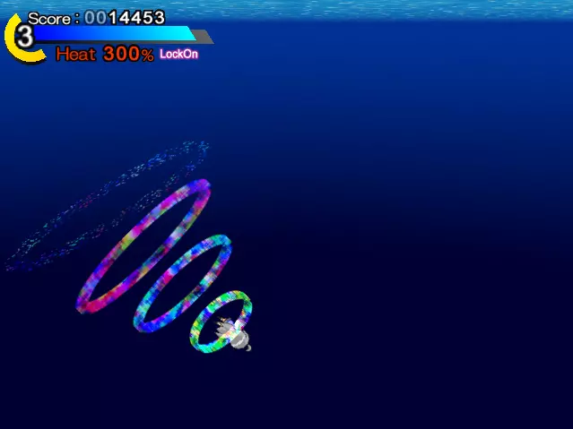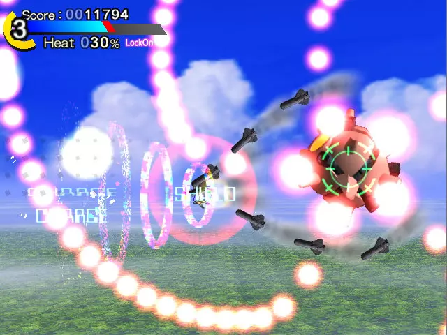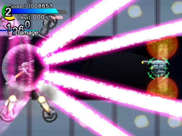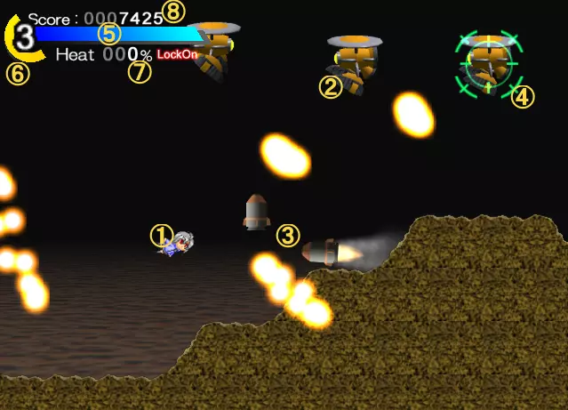 导弹会击中你(画面中央的红色圆圈是中弹效果)。 看准轨道用冲刺躲避吧 关于热量值:HP量表下方的百分比数值就是热量值。这个数值会随着持续冲刺逐渐上升,反过来停止冲刺的话就会下降到0%。 当热量值超过100%的状态下被敌方子弹击中,会在原本的伤害基础上附加与热量值相应倍率的伤害。 例如,热量值为150%时被敌方子弹击中,会受到该子弹原本伤害的1.5倍伤害。热量值最高会上升到300%,所以最大会受到3倍伤害!即便是轻微的攻击也会造成相当大的伤害。不要过度依赖冲刺,要时常停下脚步调整状态,注意保持较低的【热量值】。(尤其是连续按冲刺按钮会导致热量值急剧上升,除非万不得已,否则不要这样做!)