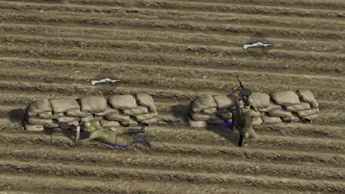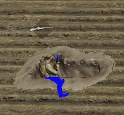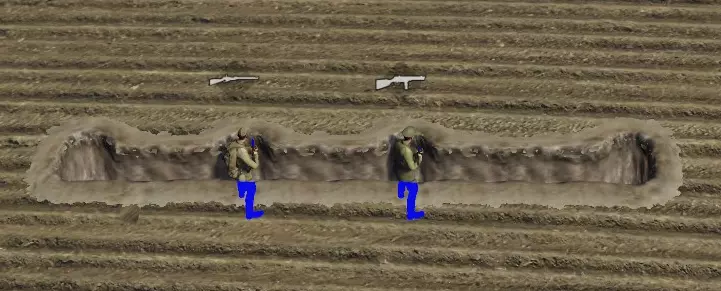 + 单位在装填弹药时不会探出掩体 + 可以为单个士兵挖掘【散兵坑】(按住Shift键点击挖掘) + 能较好地防御炮火和普通射手(当然不包括狙击手) + 按住Shift键可以建造多个工事段 - 机枪手的部分子弹会射向地面 - 无法卧倒 - 重型火炮会连工事带步兵一起摧毁 - 无法在道路和沼泽上建造