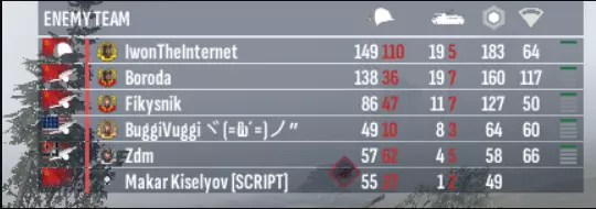 “头盔”(步兵):击杀/损失 “坦克”(载具):击杀/损失 “六边形”(个人分数):你通过击杀敌方单位获得的分数。其中不包含经验加成和夺旗经验。 “三角形”:延迟 “绿色线条”:延迟 可通过图标上方的红色线条来识别当前选中的单位。