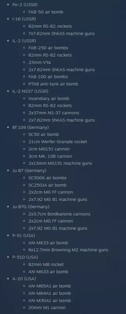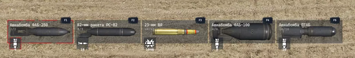 1. 针对坦克或移动中的步兵 2. 火箭弹攻击建筑物或正在埋设炸药的工兵 3. 效果不佳 4. 攻击所有可打击目标。这是威力极强的炸弹。 5. 用于破坏重型模块 航空后撤模式: